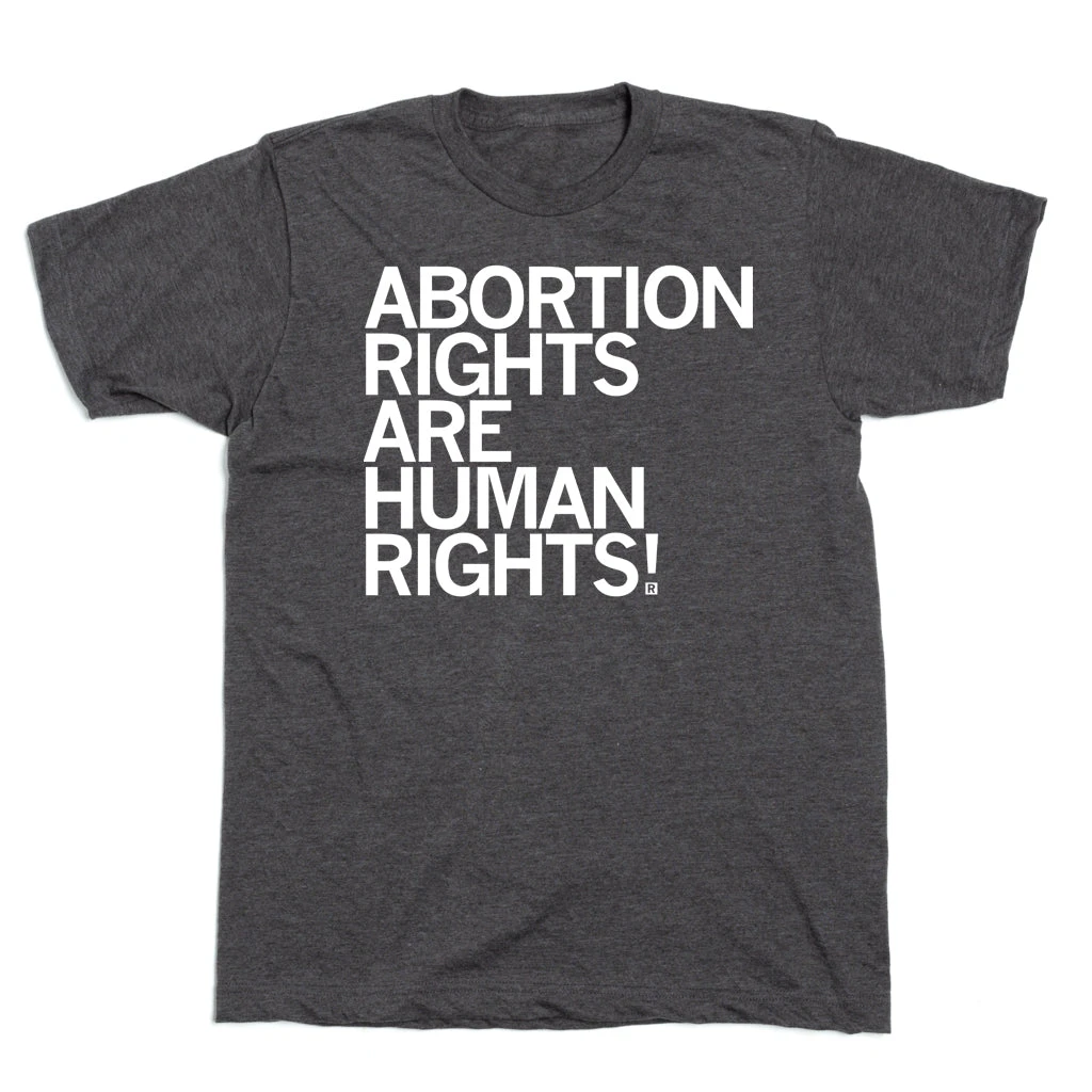 Abortion Rights Are Human Rights. Some proceeds from sales go to Planned Parenthood North Central States. White Screen Print on a Charcoal T-Shirt (Standard Sizes are 50% Combed Ringspun Cotton / 50% Polyester | Snug Sizes are 65% Polyester / 35% Combed Ringspun Cotton). Cut & sewn sweatshop free. Designed and Printed by Union Labor at RAYGUN.