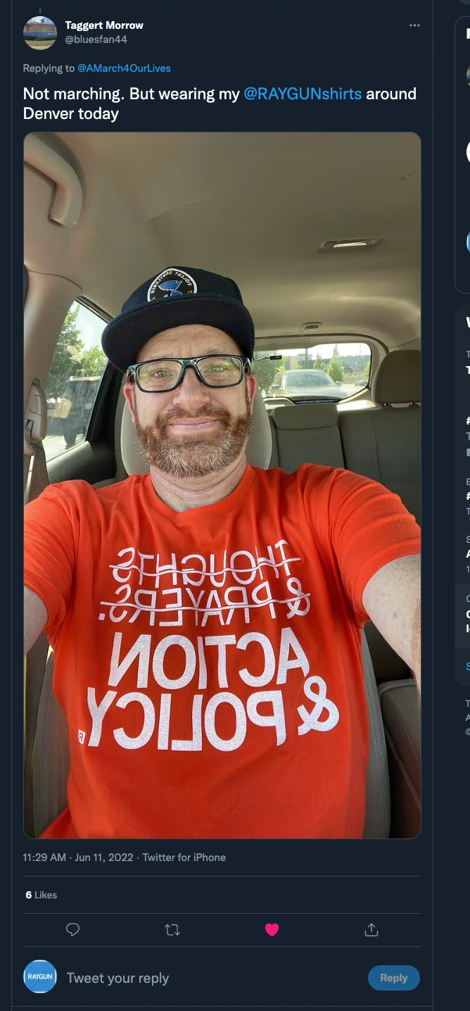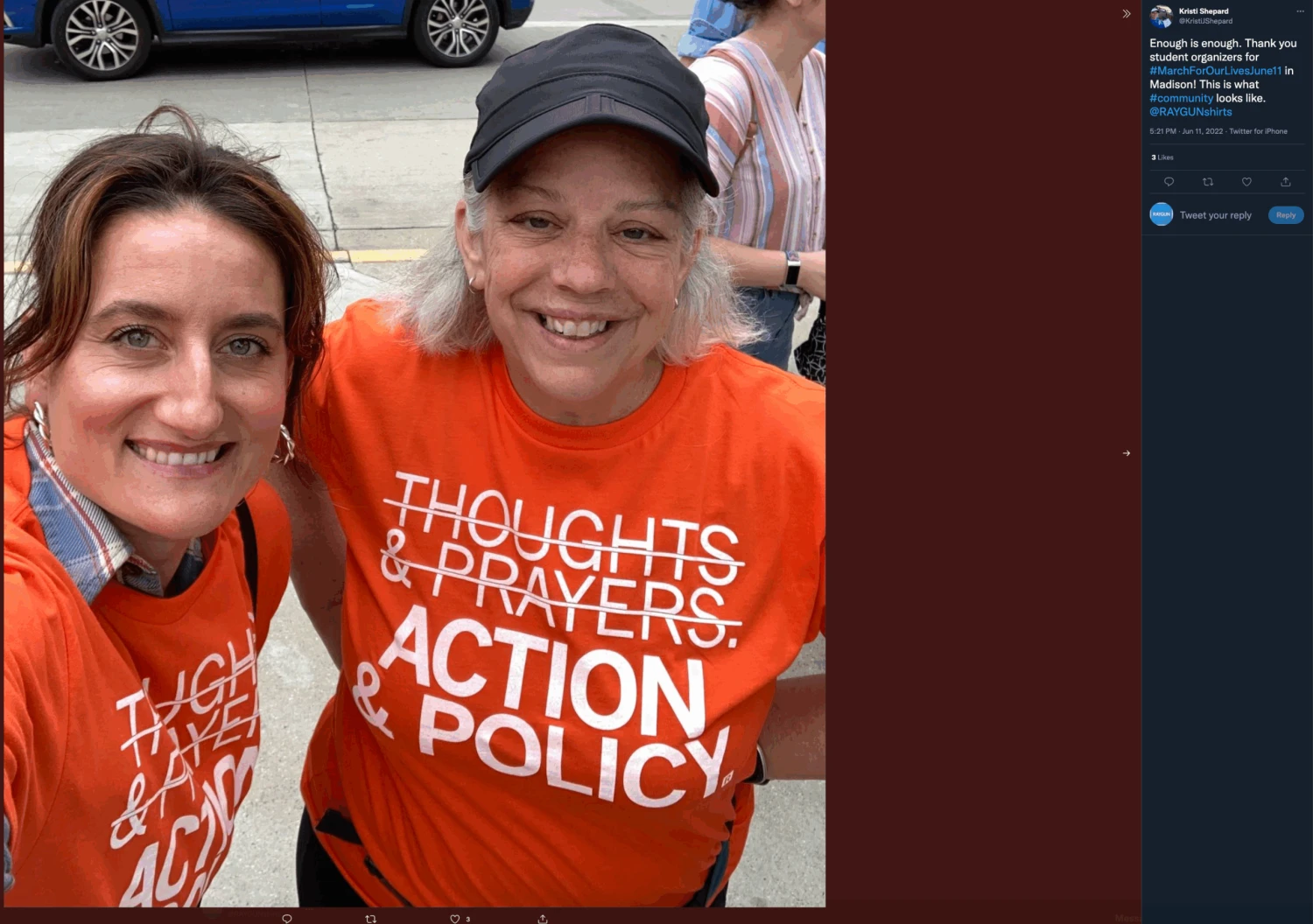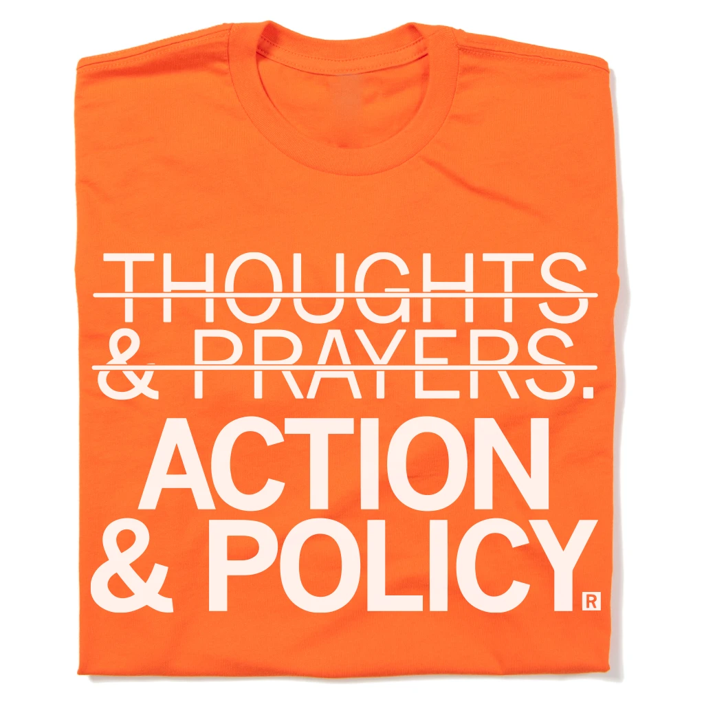 Thoughts & Prayers Action & Policy. A portion of sales go to efforts being made for sensible gun laws. Personally we support Giffords Law Center To Prevent Gun Violence. White Screen Print on an Orange T-shirt (100% Combed and Ringspun Cotton). Cut and sewn sweatshop free. Designed and printed by Union Labor at RAYGUN!