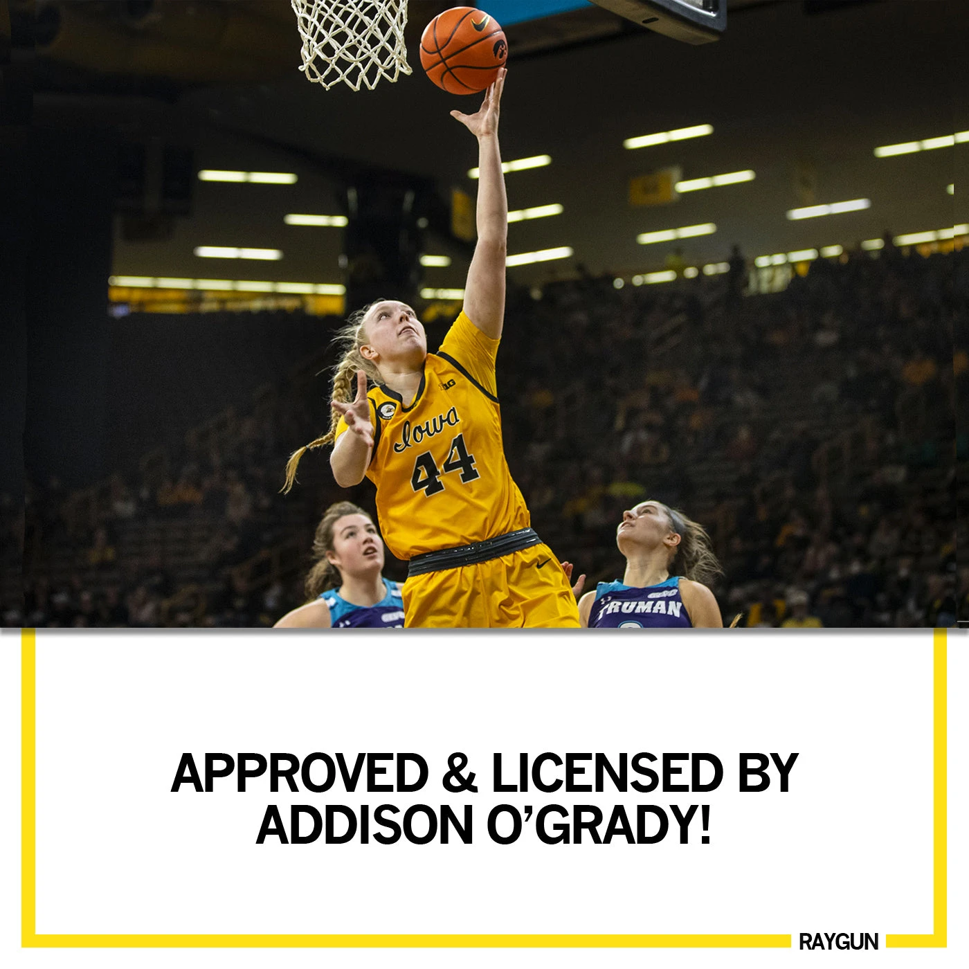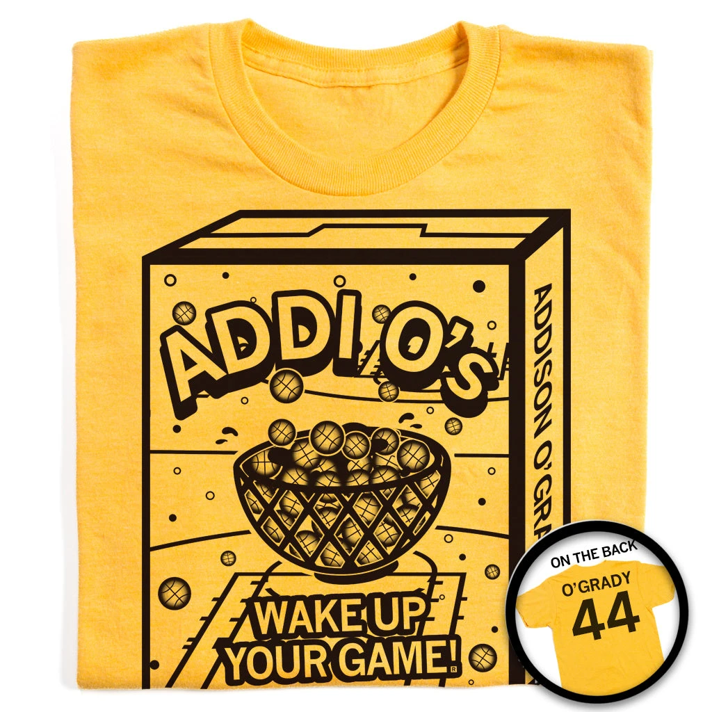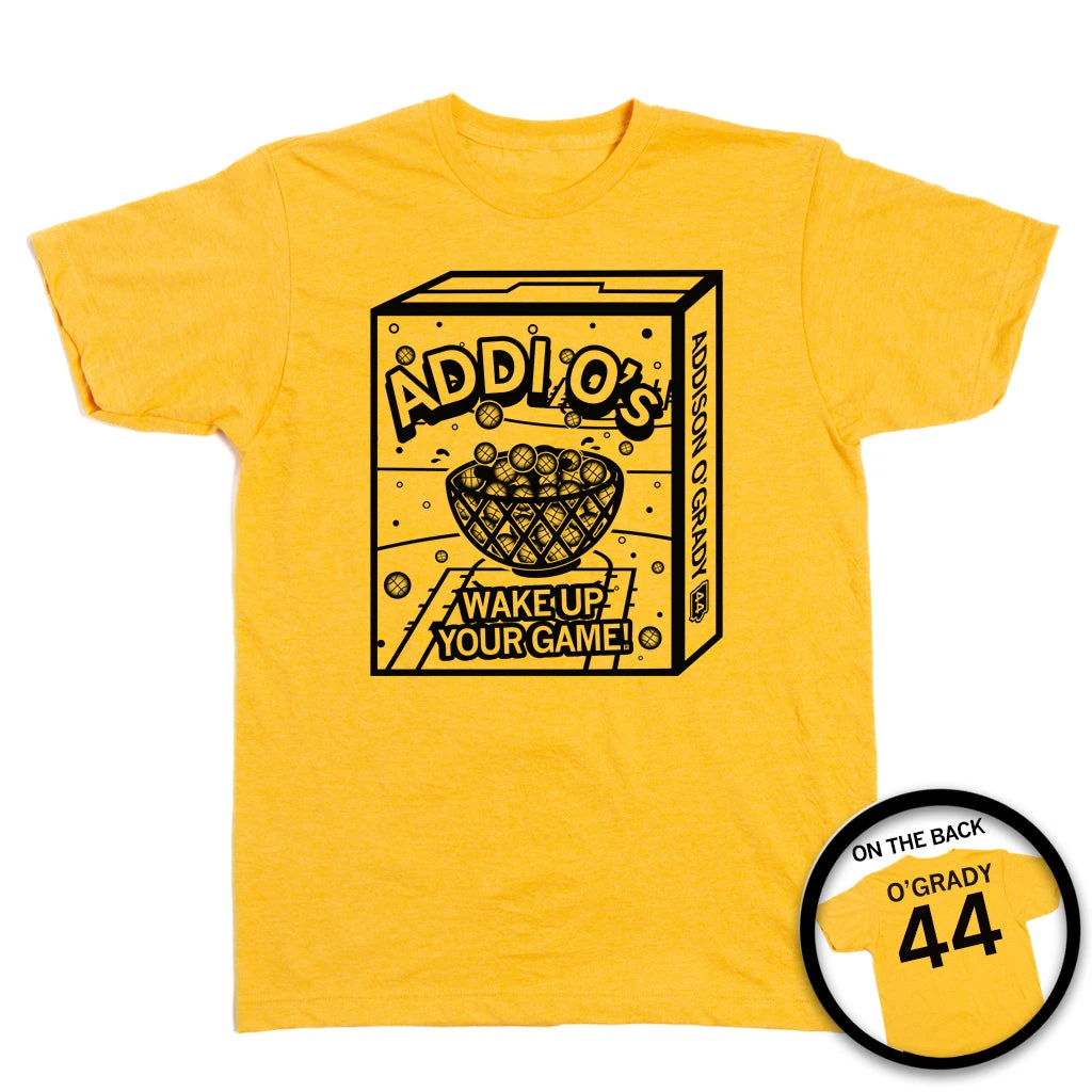 Addi O’s: Wake up your game! Officially licensed with Addison O’Grady. A Portion of All RAYGUN Sales Raise Money For Organizations That We Support. Black Screen Print on a Heather Mellow Yellow T-shirt (50% Combed Ringspun Cotton / 50% Polyester). Cut and sewn sweatshop free. Designed and printed by Union Labor at RAYGUN.