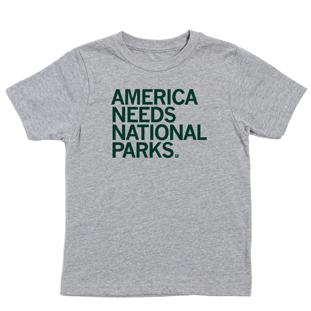 America Needs National Parks. A Portion of All RAYGUN Sales Raise Money For Organizations That We Support, like the Environmental Law & Policy Center. Chrome Green Screen Print on a Heather Grey Shirt (90% Cotton / 10% Polyester). Cut and sewn sweatshop free. Designed and printed by Union Labor at RAYGUN.