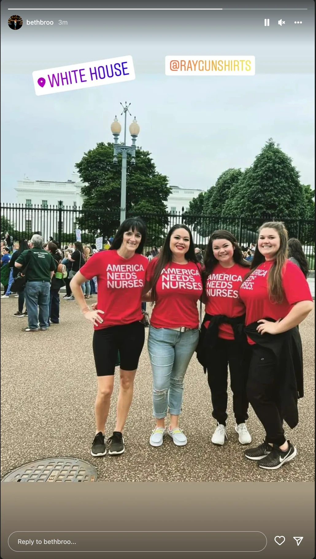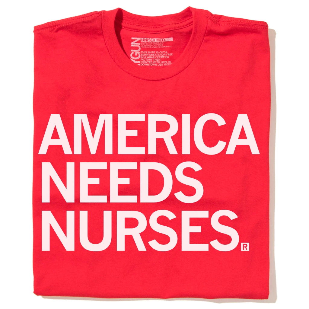 America Needs Nurses. A Portion of All RAYGUN Sales Raise Money For Organizations That We Support. White Screen Print on a Red T-shirt (100% Combed Ringspun Cotton). Cut and sewn sweatshop free. Designed and printed by Union Labor at RAYGUN.