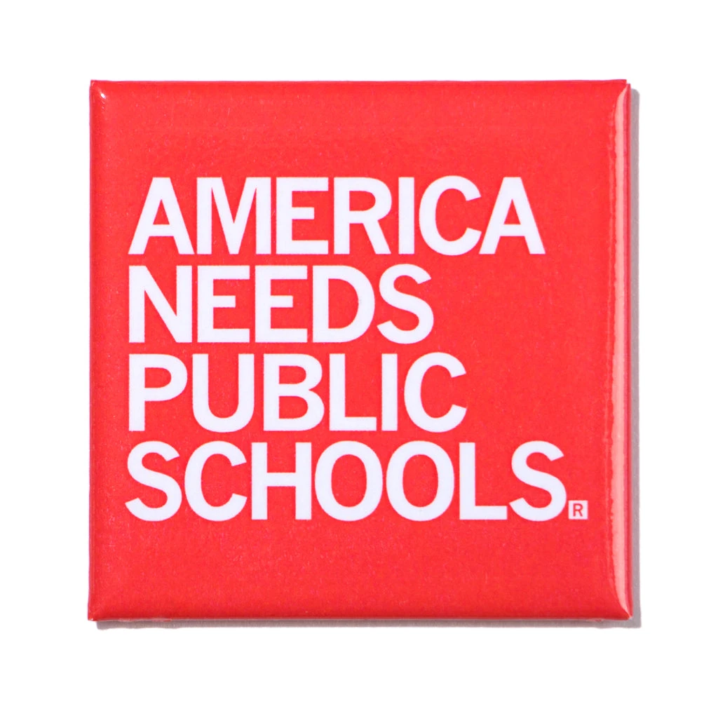 America Needs Public Schools. 2″ x 2″ Metal Magnet. Designed by RAYGUN and made by union labor at Garner Printing in Des Moines, IA.