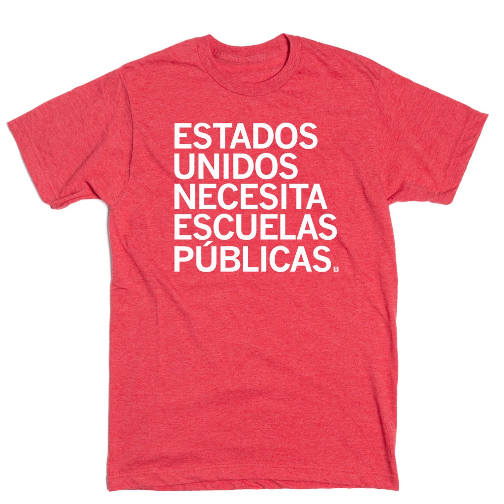 Estados Unidos Necesita Escuelas Públicas. A Portion of All RAYGUN Sales Raise Money For Organizations That We Support. White Screen Print on a Heather Red T-shirt (50% Combed Ringspun Cotton / 50% Polyester). Cut and sewn sweatshop free. Designed and printed by Union Labor at RAYGUN.