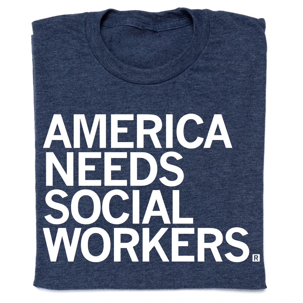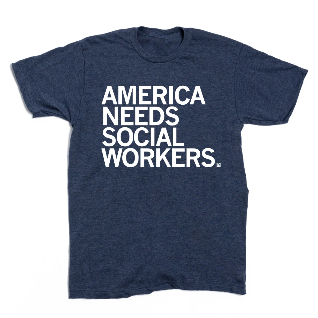America Needs Social Workers. A Portion of All RAYGUN Sales Raise Money For Organizations That We Support. White Screen Print on a Heather Denim T-shirt (50% Combed Ringspun Cotton / 50% Polyester). Cut & sewn sweatshop free. Designed and Printed by Union Labor at RAYGUN.