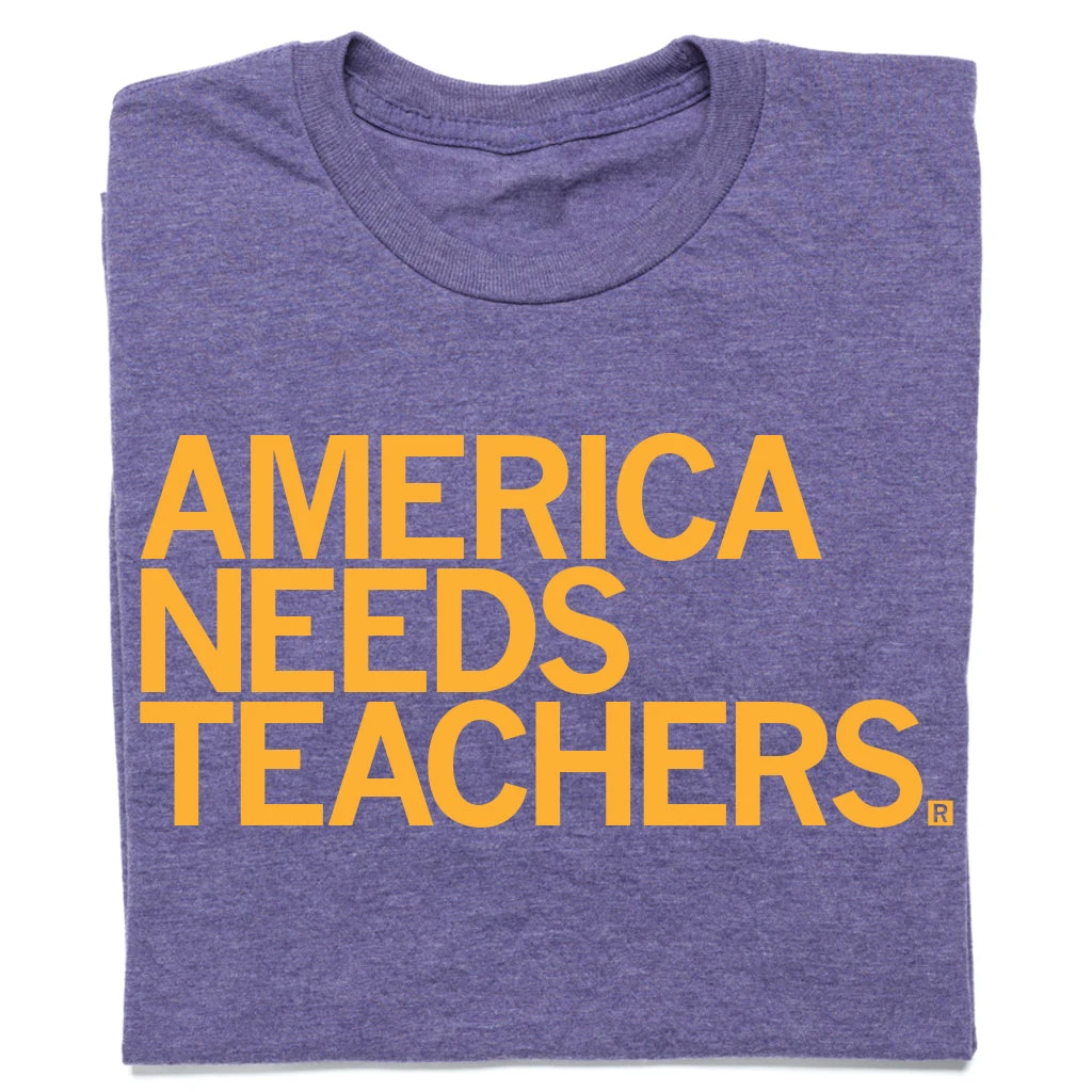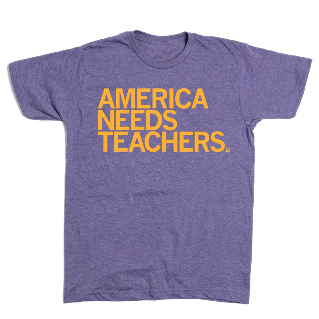 America Needs Teachers. A Portion of All Raygun Sales Raise Money For Organizations That We Support. Gold Screen Print on a Heather Purple T-Shirt (50% Combed Ringspun Cotton / 50% Polyester). Cut & sewn sweatshop free. Designed and Printed by Union Labor at RAYGUN.