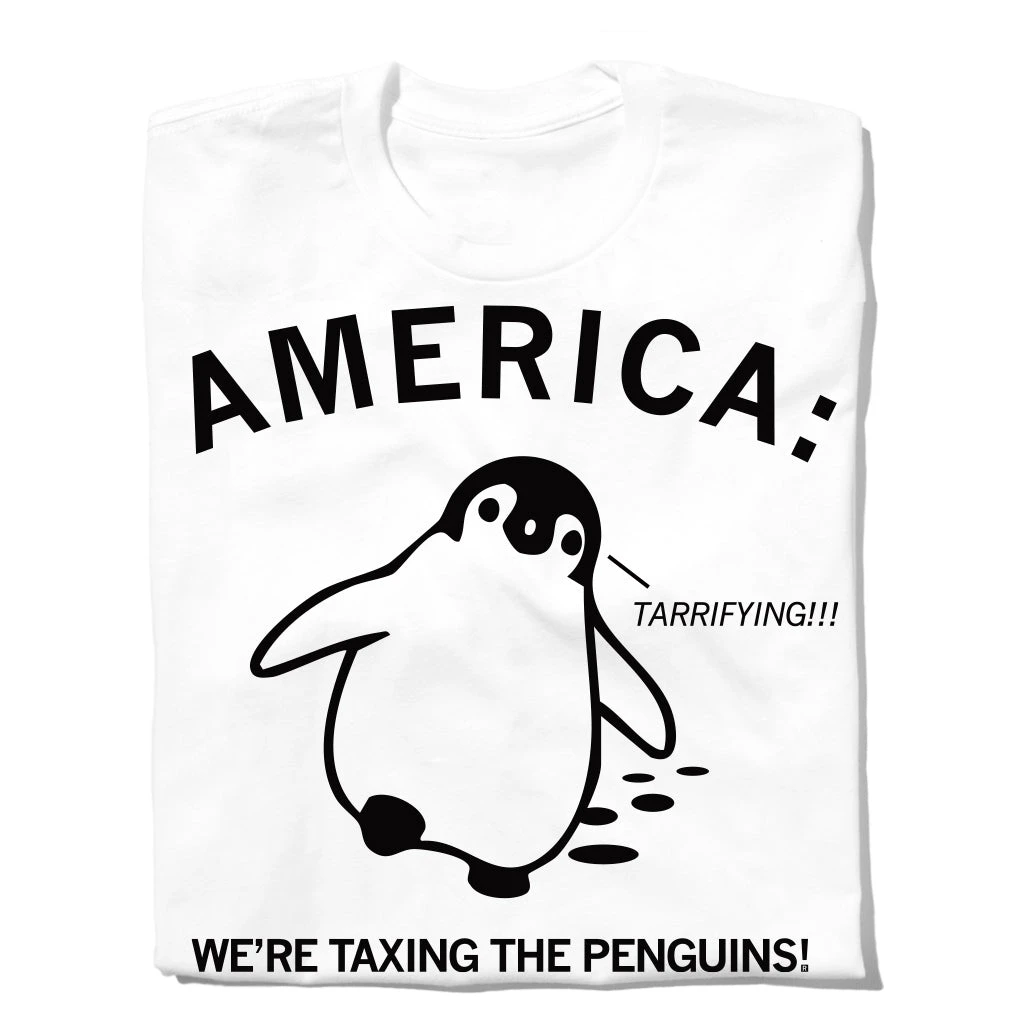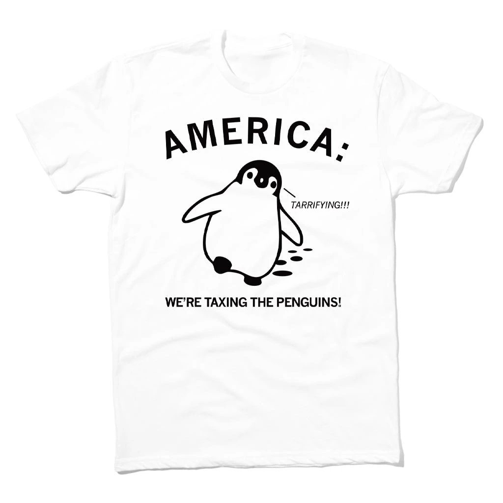 America: we’re taxing the penguins! Hope they have money. A Portion of All RAYGUN Sales Raise Money For Organizations That We Support. Black Screen Print on a White T-shirt (100% Combed Ringspun Cotton). Cut & sewn sweatshop free. Designed and Printed by Union Labor at RAYGUN.