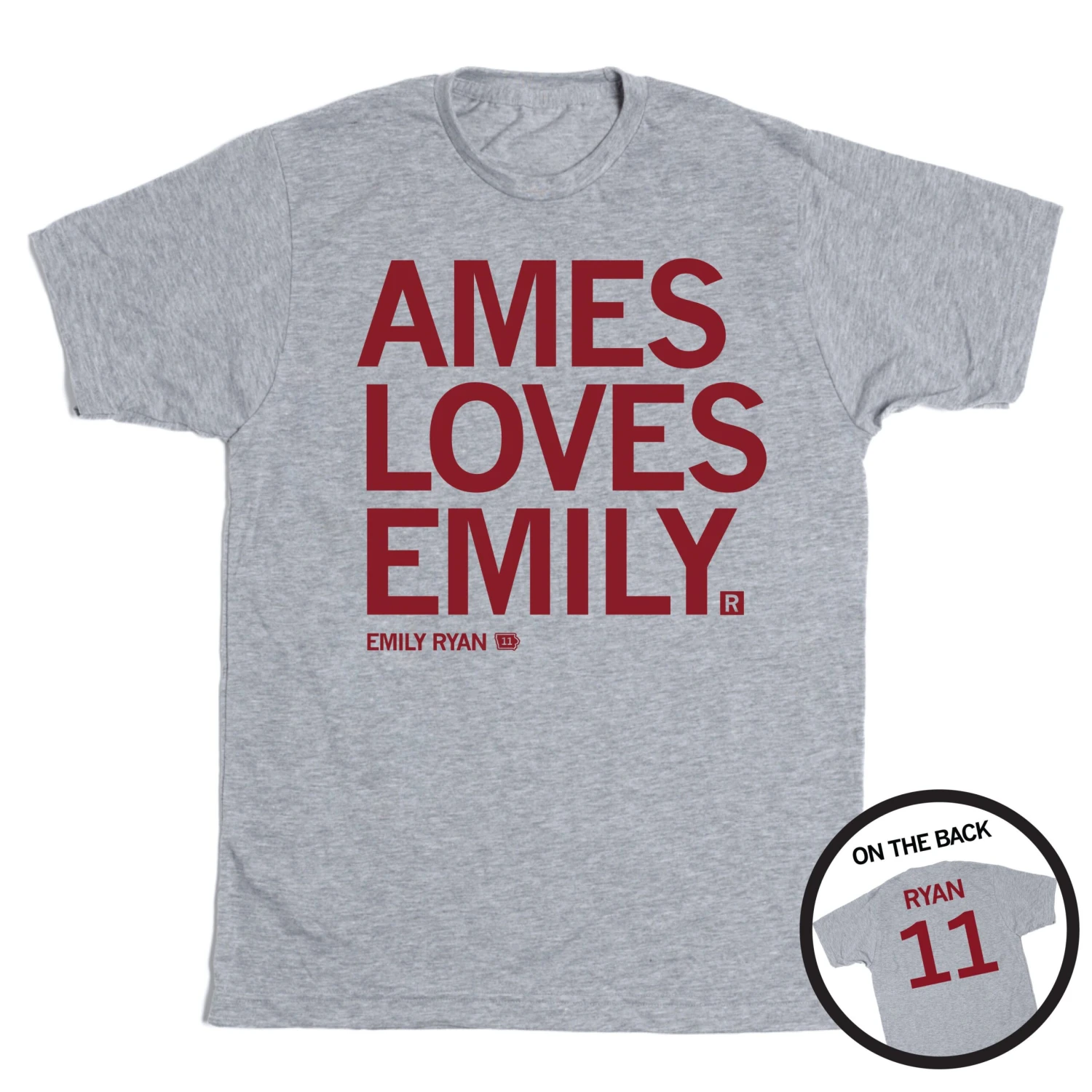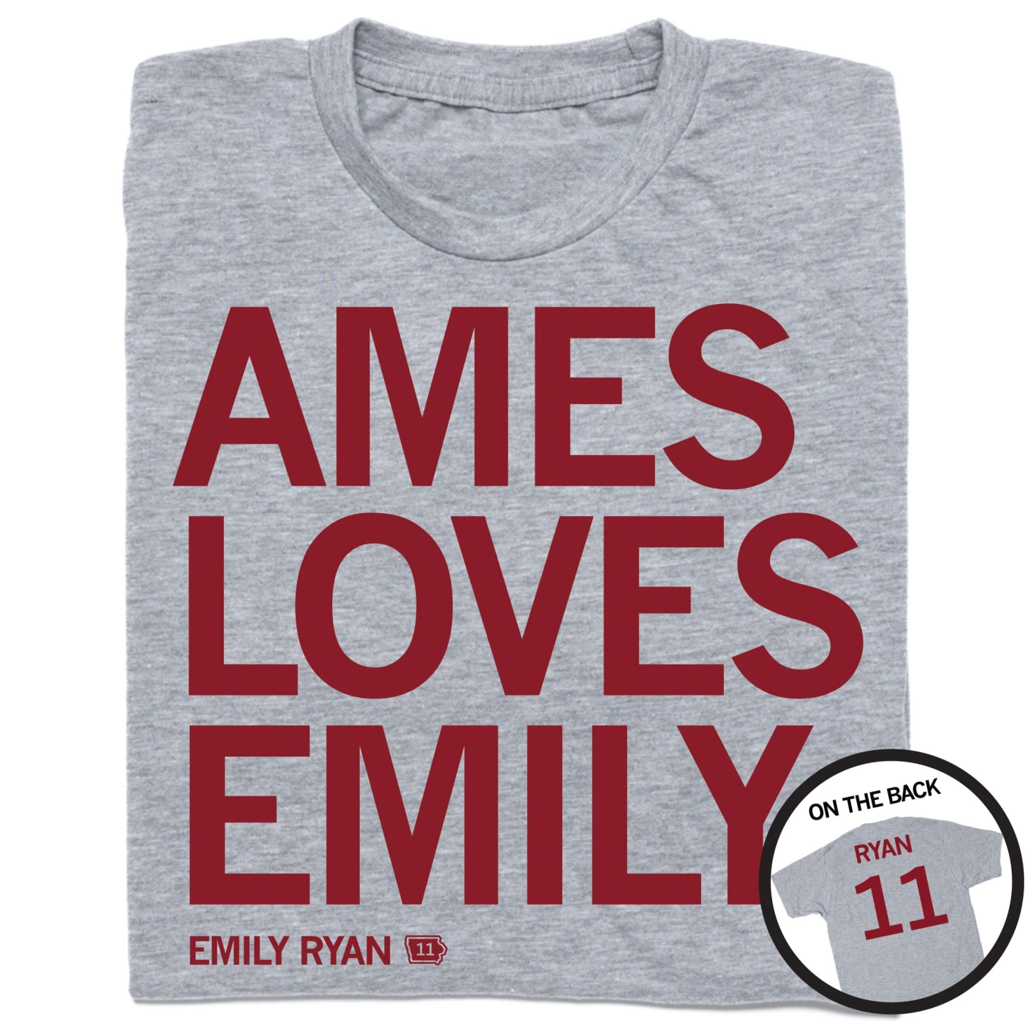 Ames Loves Emily Ryan. Officially licensed with Emily Ryan. This shirt has been approved by Emily Ryan. A Portion of All RAYGUN Sales Raise Money For Organizations That We Support. Cardinal Screen Print on a Heather Grey T-shirt (65% Polyester / 35% Combed Ringspun Cotton). Cut & sewn sweatshop free. Designed and Printed by Union Labor at RAYGUN.