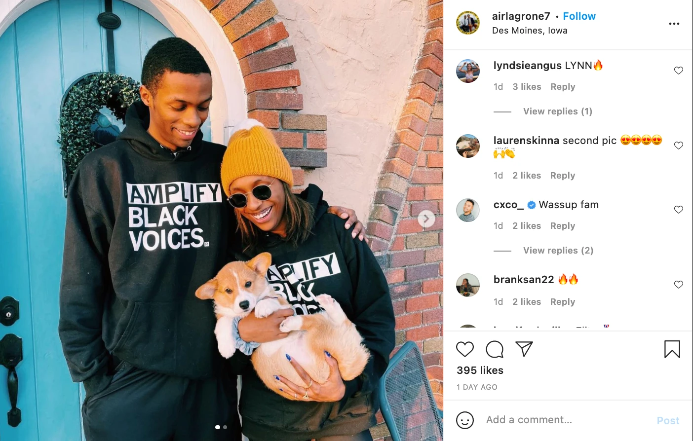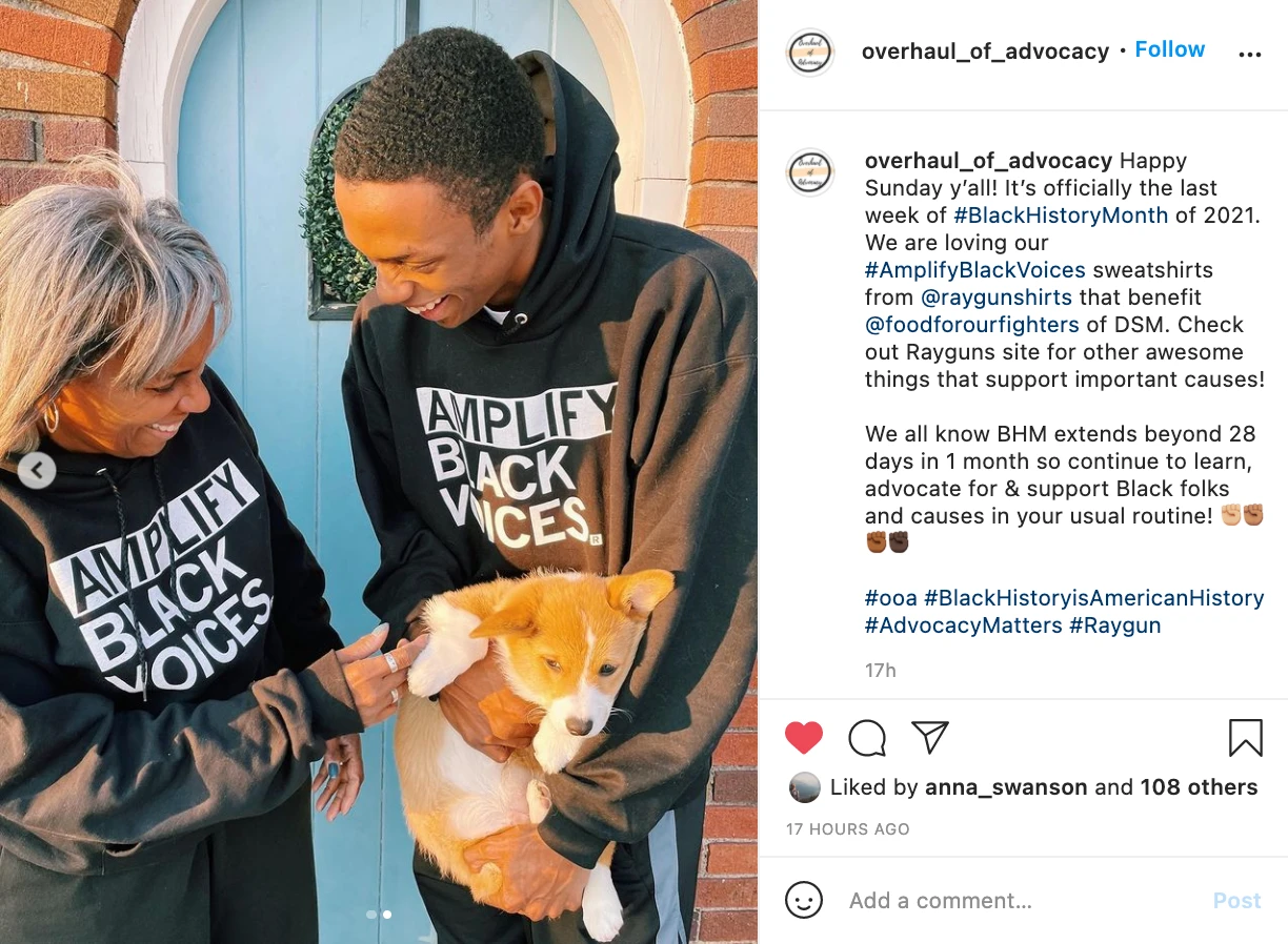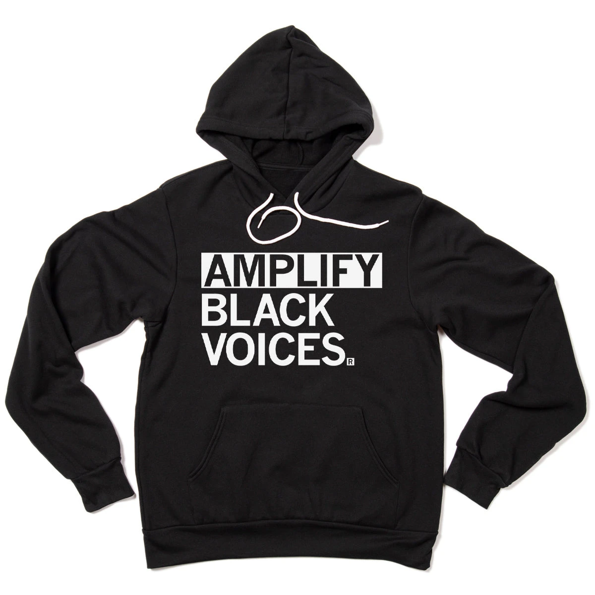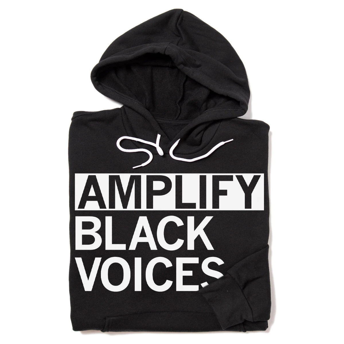 Amplify Black Voices. 100% of Profits From This Shirt go to Food For Our Fighters and their efforts to keep Des Moines BLM protestors fed and hydrated in the fight for justice. White Screen Print on a Black Pullover Hoodie (80% Combed and Ringspun Cotton / 20% Polyester). Cut and sewn sweatshop free. Designed and printed by Union Labor at RAYGUN.