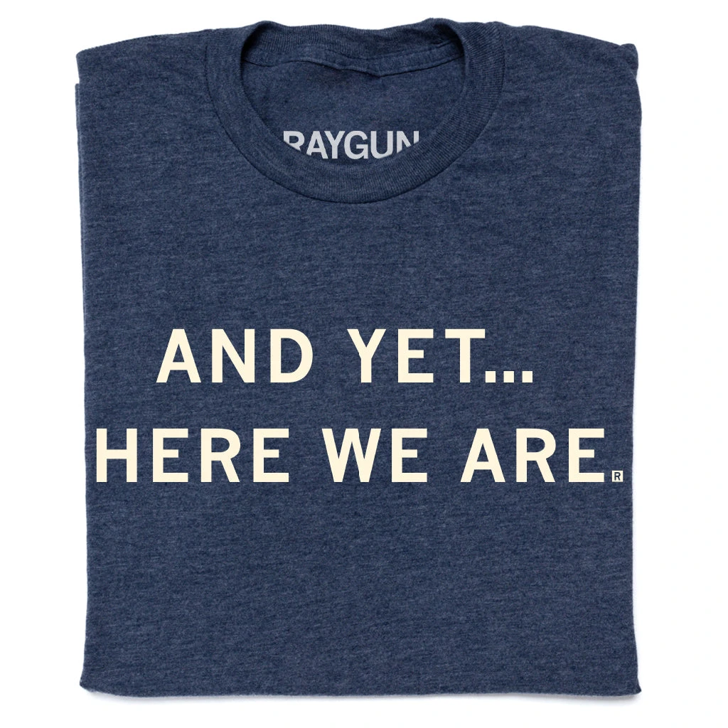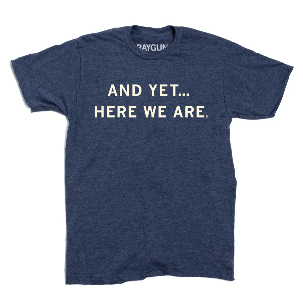 And yet…here we are. A Portion of All RAYGUN Sales Raise Money For Organizations That We Support. Peach Screen Print on a Heather Denim T-shirt (50% Combed Ringspun Cotton / 50% Polyester). Cut & sewn sweatshop free. Designed and Printed by Union Labor at RAYGUN.