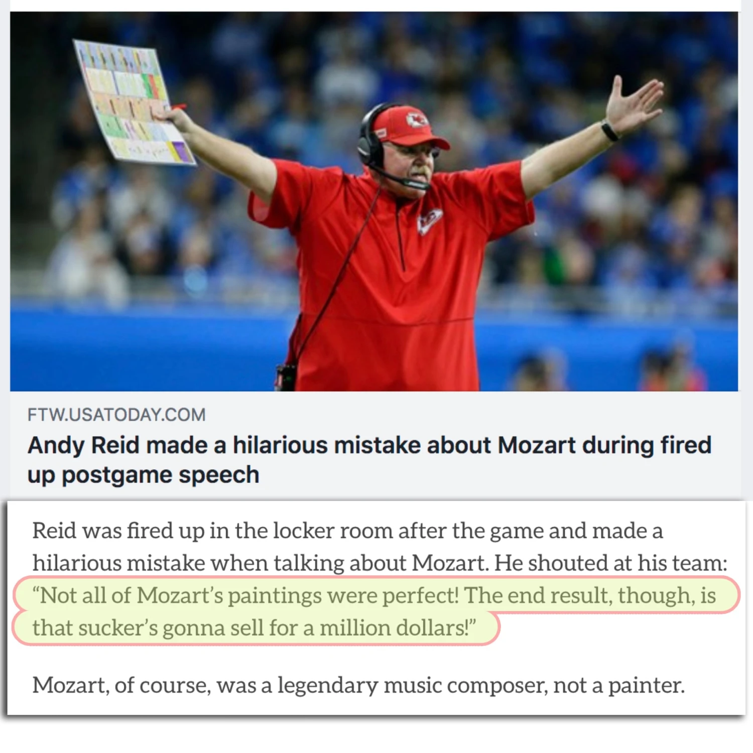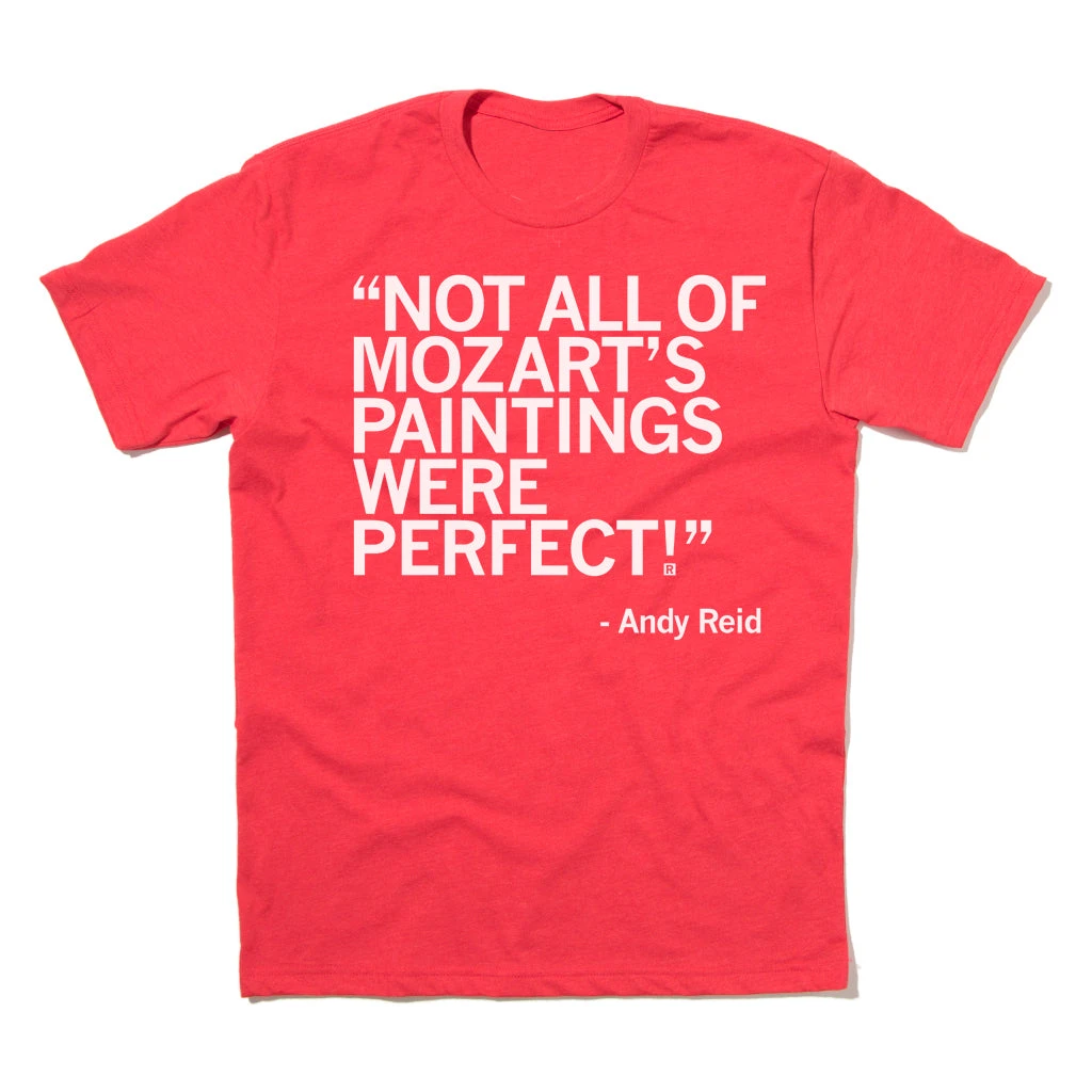 “Not All of Mozart’s Paintings Were Perfect.” – Andy Reid. This Design Has Been Retired and is No Longer Available on Our Sales Floors But Can Be Ordered Here Online! Since All of Our Retired Designs Are Printed on Demand, Please Allow For a Couple Extra Days Before Shipping. A Portion of All RAYGUN Sales Raise Money For Organizations That We Support. White Screen Print on a Heather Red T-shirt (50% Combed Ringspun Cotton / 50% Polyester). Cut and sewn sweatshop free. Designed and printed by Union Labor at RAYGUN.