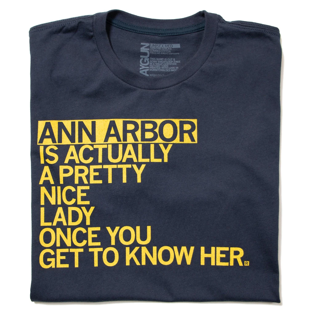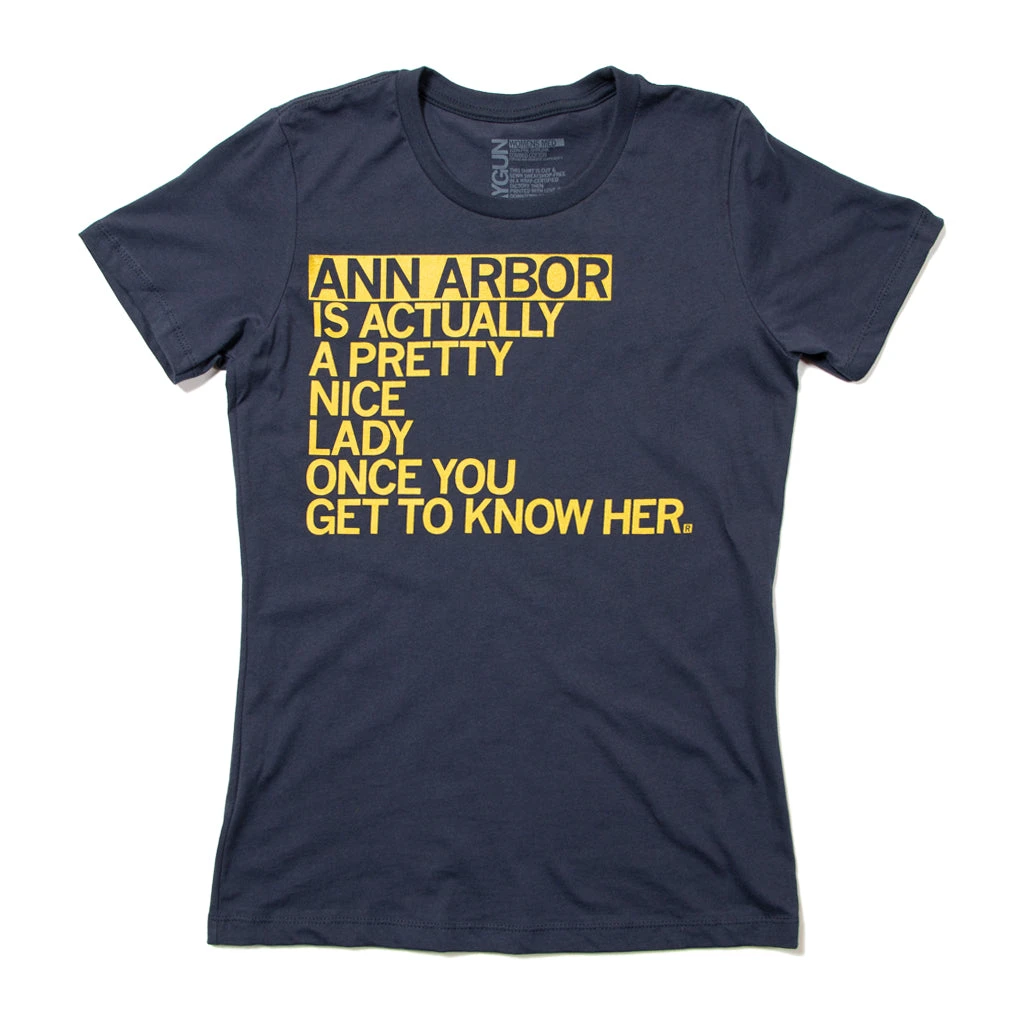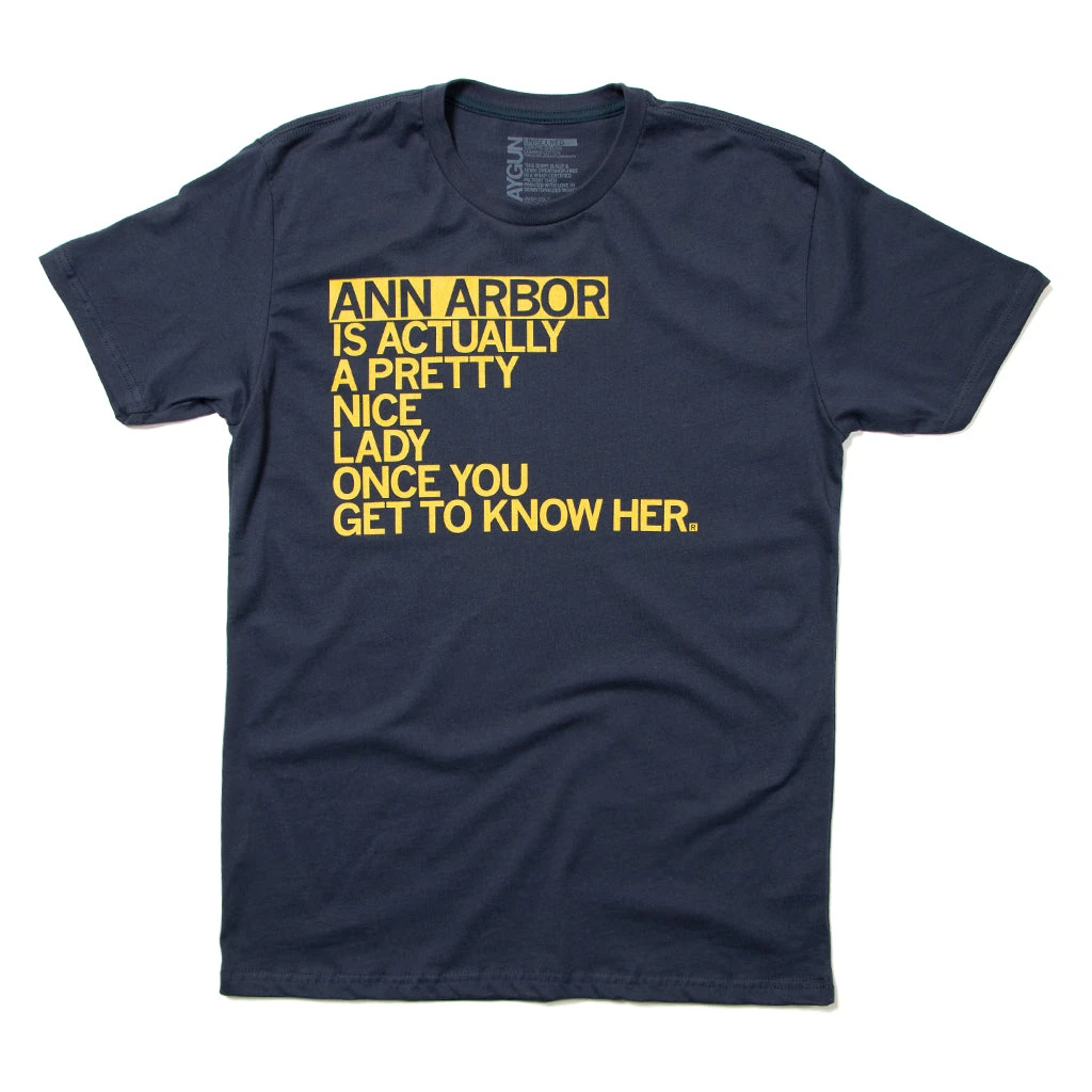 Ann Arbor Is Actually Pretty Nice Once You Get To Know Her. This Design Has Been Retired and is No Longer Available on Our Sales Floors But Can Be Ordered Here Online! Since All of Our Retired Designs Are Printed on Demand, Please Allow For a Couple Extra Days Before Shipping. A Portion of All Raygun Sales Raise Money For Organizations That We Support. Gold Screen Print on a Navy T-shirt (100% Preshrunk Combed Cotton) Cut & sewn sweatshop free. Designed and Printed by Union Labor at RAYGUN
