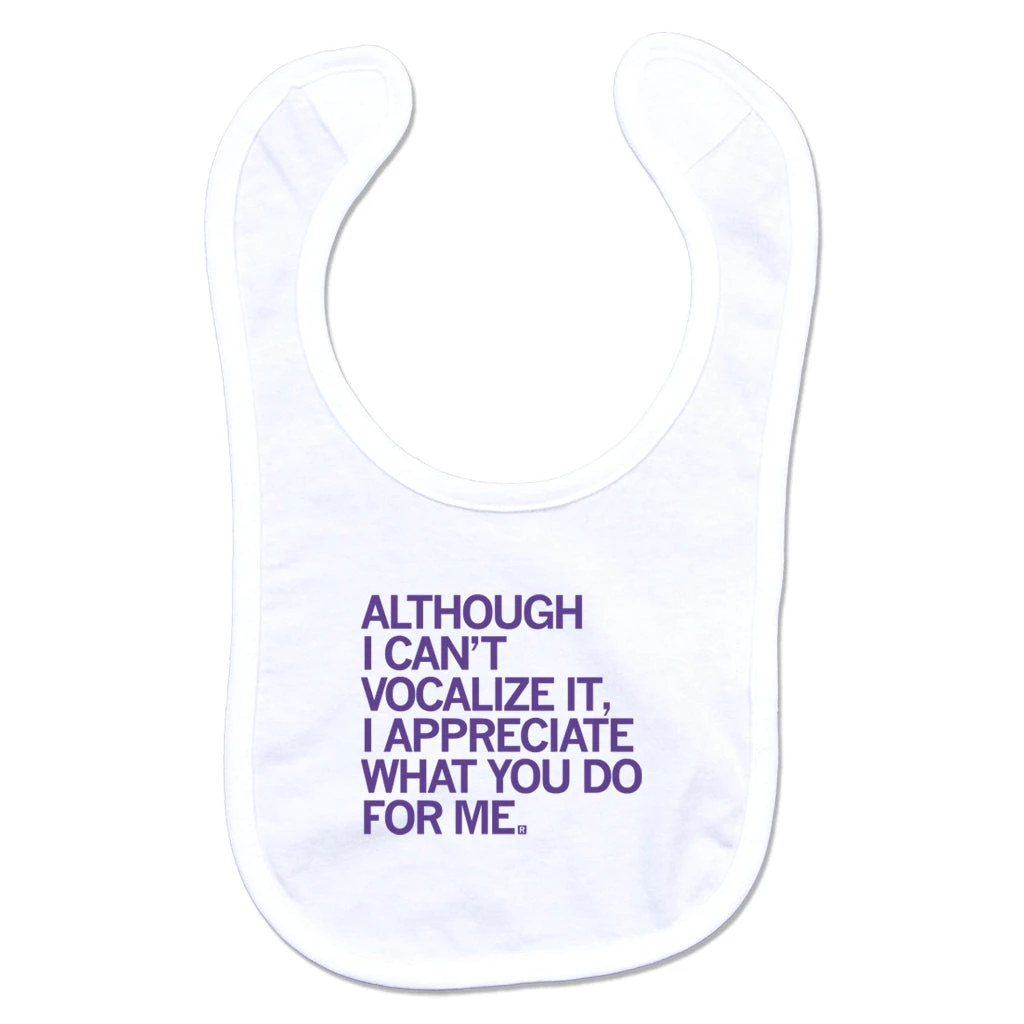 Although I Can’t Vocalize It, I Appreciate What You Do For Me. A Portion of All RAYGUN Sales Raise Money For Organizations That We Support. Purple Screen Print on a White Bib (100% Baby Rib Cotton). Cut and sewn sweatshop free. Designed and printed by Union Labor at RAYGUN.