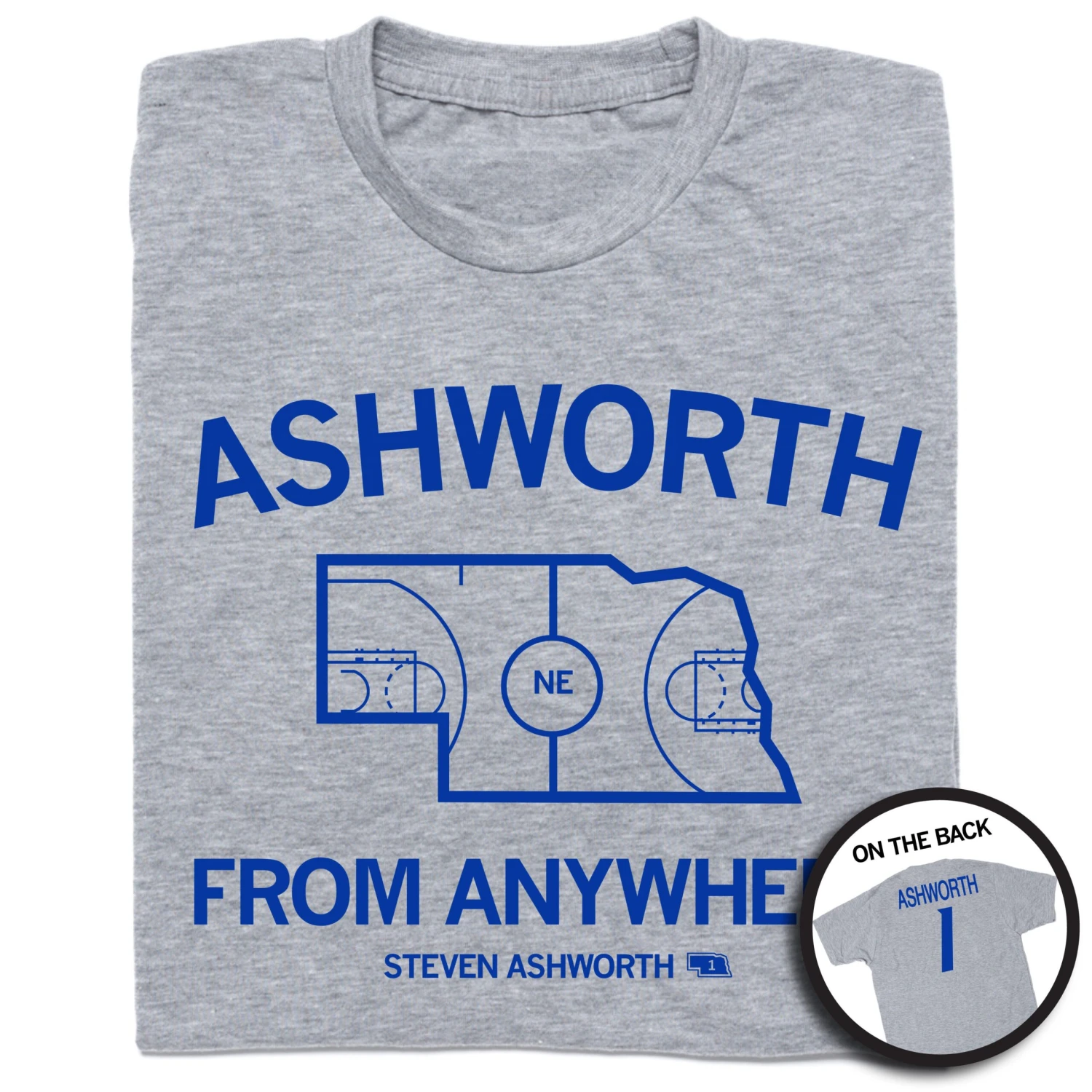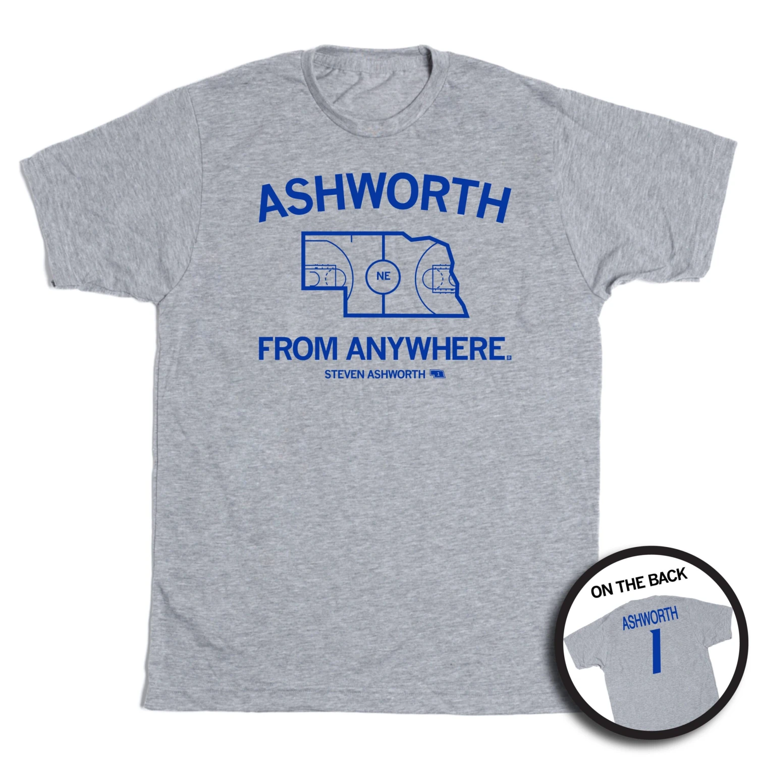 Ashworth From Anywhere. Officially licensed with Steven Ashworth. This shirt has been approved by Steven Ashworth. A Portion of All RAYGUN Sales Raise Money For Organizations That We Support. Ultramarine Blue Screen Print on a Heather Grey T-shirt (65% Polyester / 35% Combed Ringspun Cotton). Cut & sewn sweatshop free. Designed and Printed by Union Labor at RAYGUN.