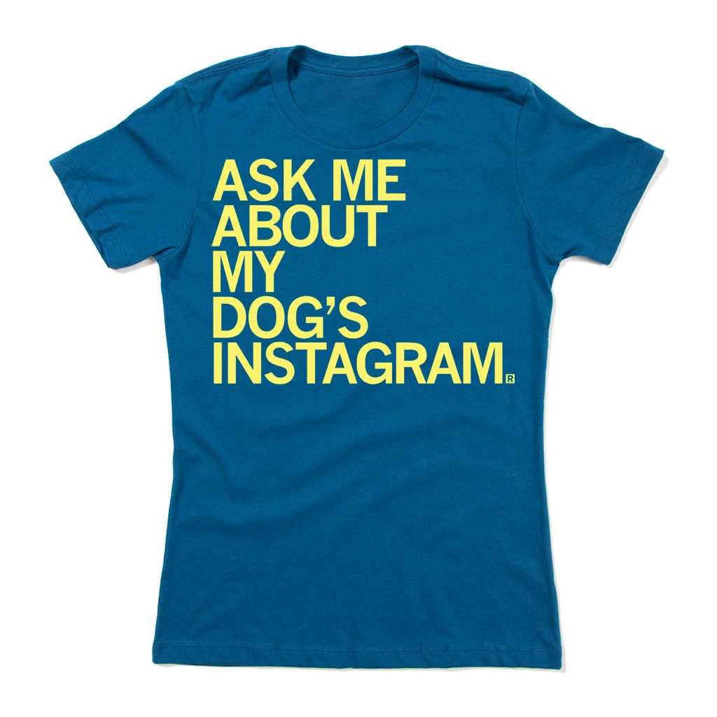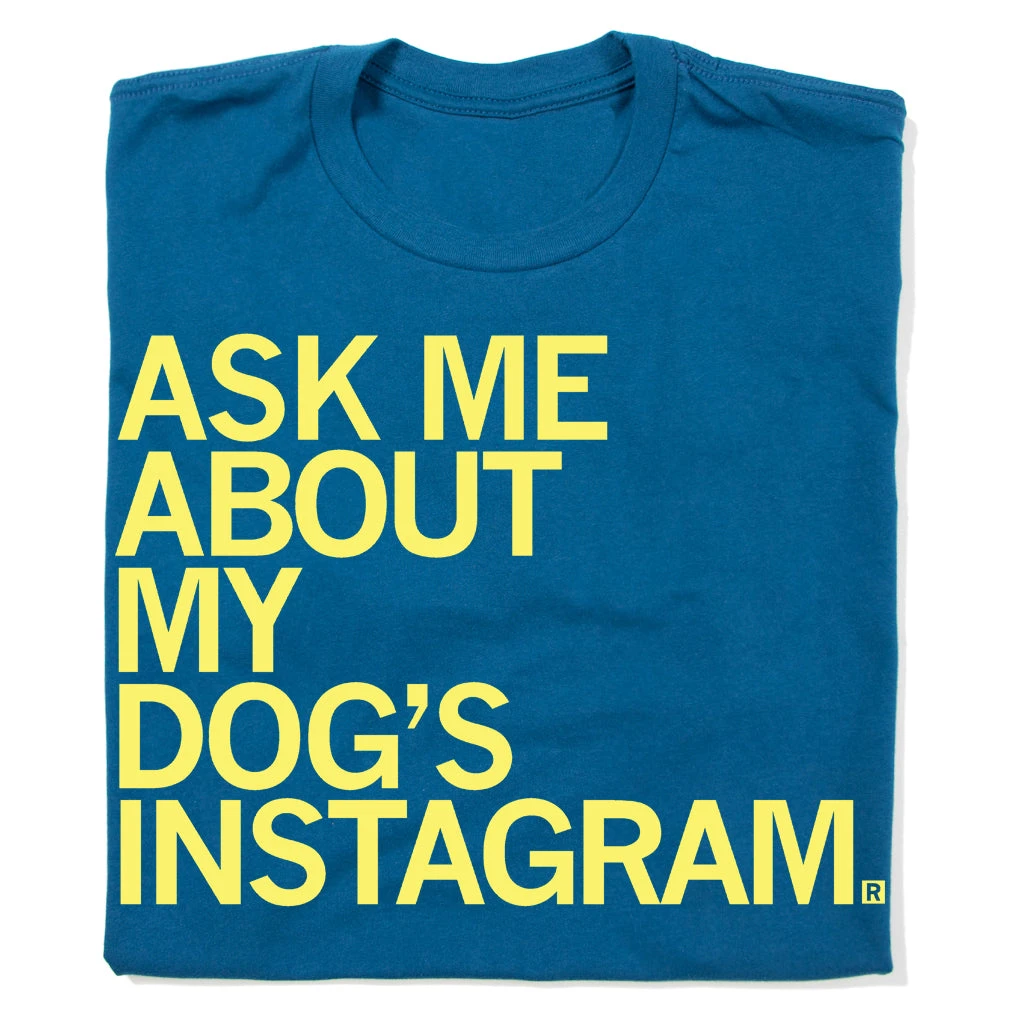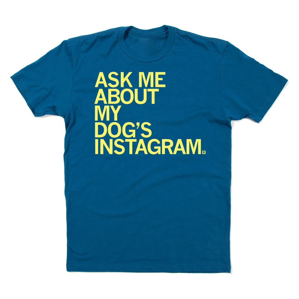 Ask Me About My Dog’s Instagram. A Portion of All RAYGUN Sales Raise Money For Organizations That We Support. Primrose Screen Print on a Cool Blue T-shirt (100% Combed Ringspun Cotton). Cut and sewn sweatshop free. Designed and printed by Union Labor at RAYGUN.
