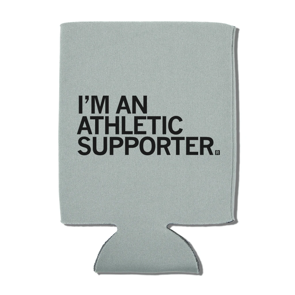 I’m an Athletic Supporter. Black plastisol ink print on grey fade-resistant polyester covered scuba foam. Designed by RAYGUN. Imported and printed in the USA.