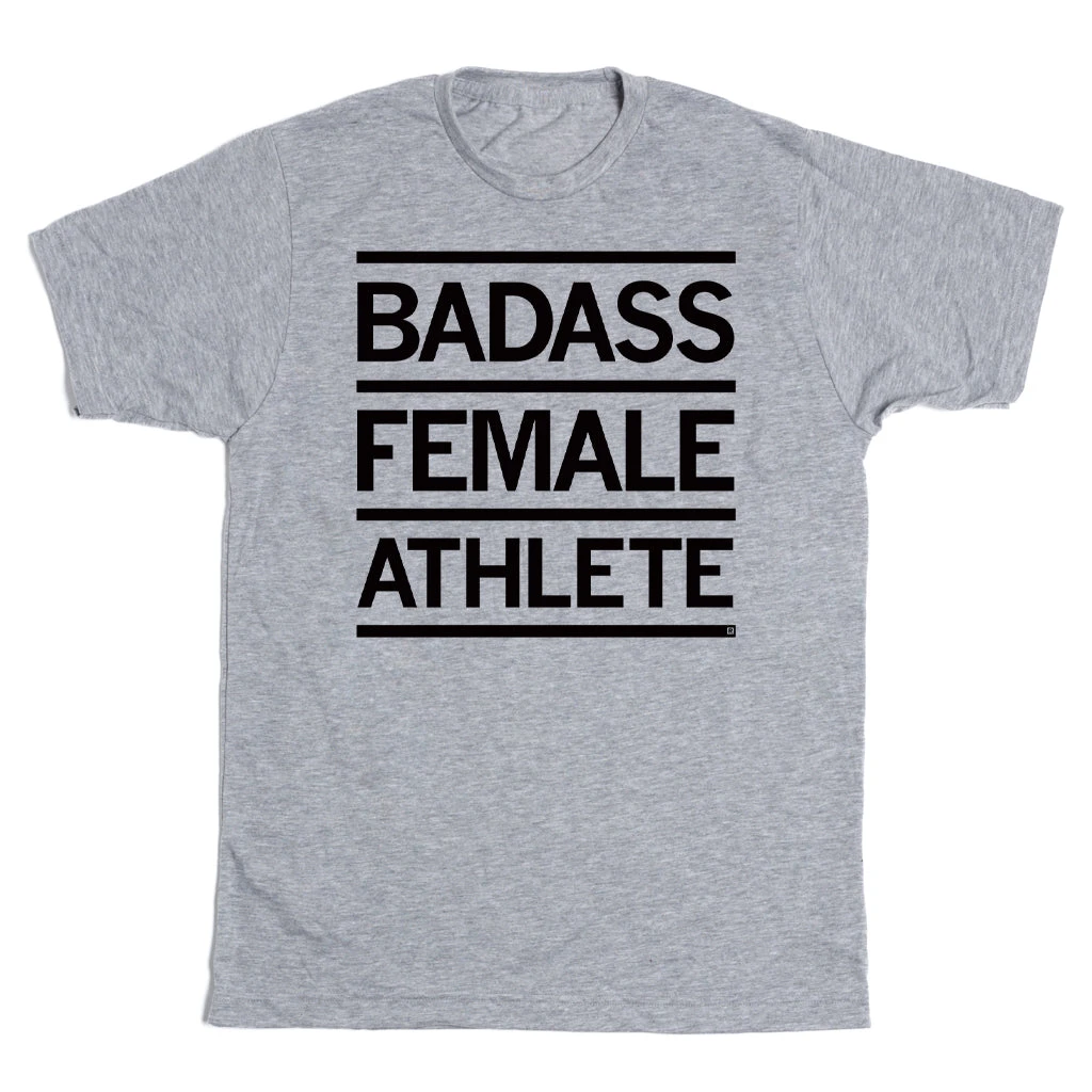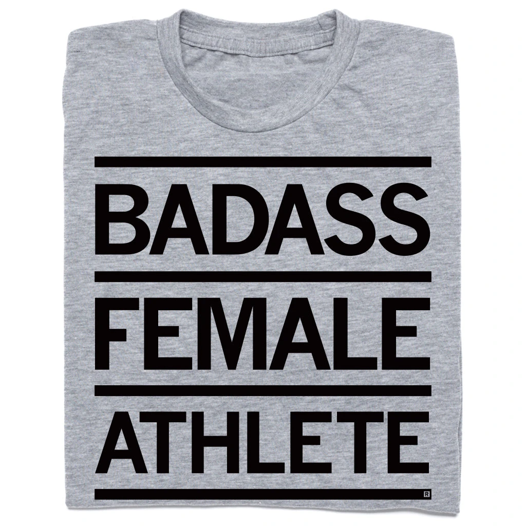 Badass female athlete. A Portion of All Raygun Sales Raise Money For Organizations That We Support. Black Screen Print on a Heather Grey T-shirt (65% Polyester / 35% Combed Ringspun Cotton) Cut & sewn sweatshop free. Designed and Printed by Union Labor at RAYGUN