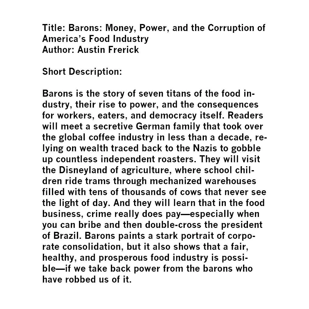 Barons is the story of seven titans of the food industry, their rise to power, and the consequences for workers, eaters, and democracy itself.