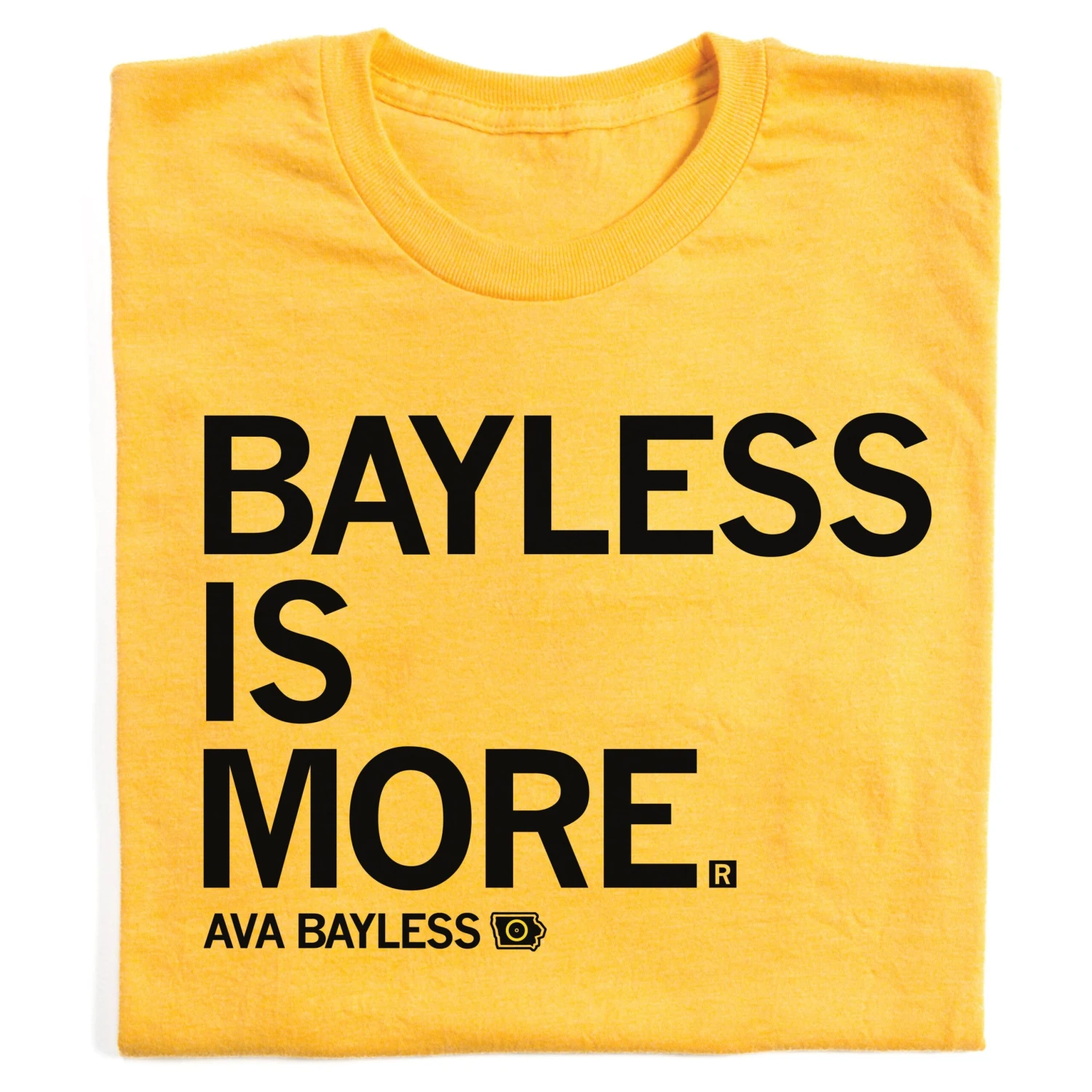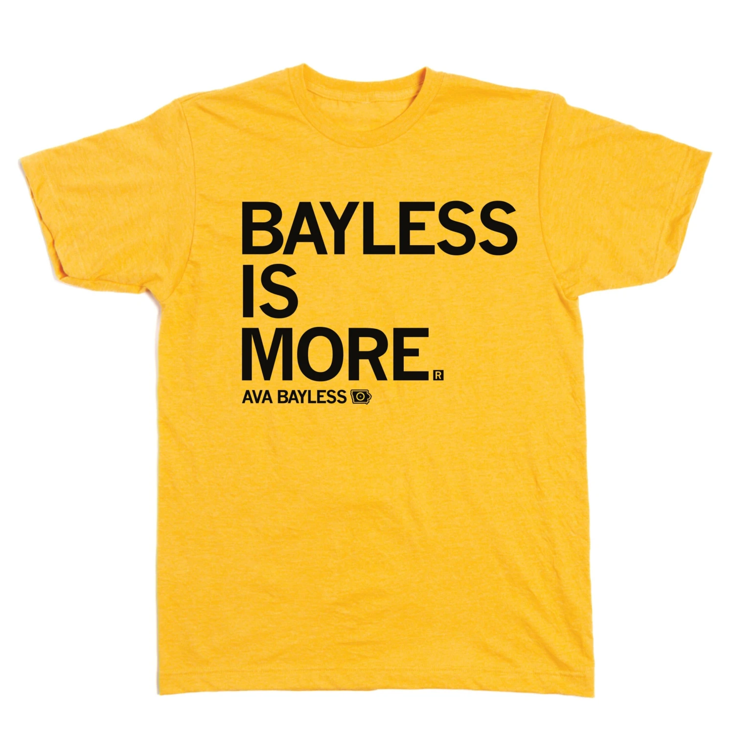 (Ava) Bayless is More. Officially licensed with Ava Bayless. This shirt has been approved by Ava Bayless. A Portion of All RAYGUN Sales Raise Money For Organizations That We Support. Black Screen Print on a Heather Mellow Yellow T-shirt (50% Combed Ringspun Cotton / 50% Polyester). Cut & sewn sweatshop free. Designed and Printed by Union Labor at RAYGUN.