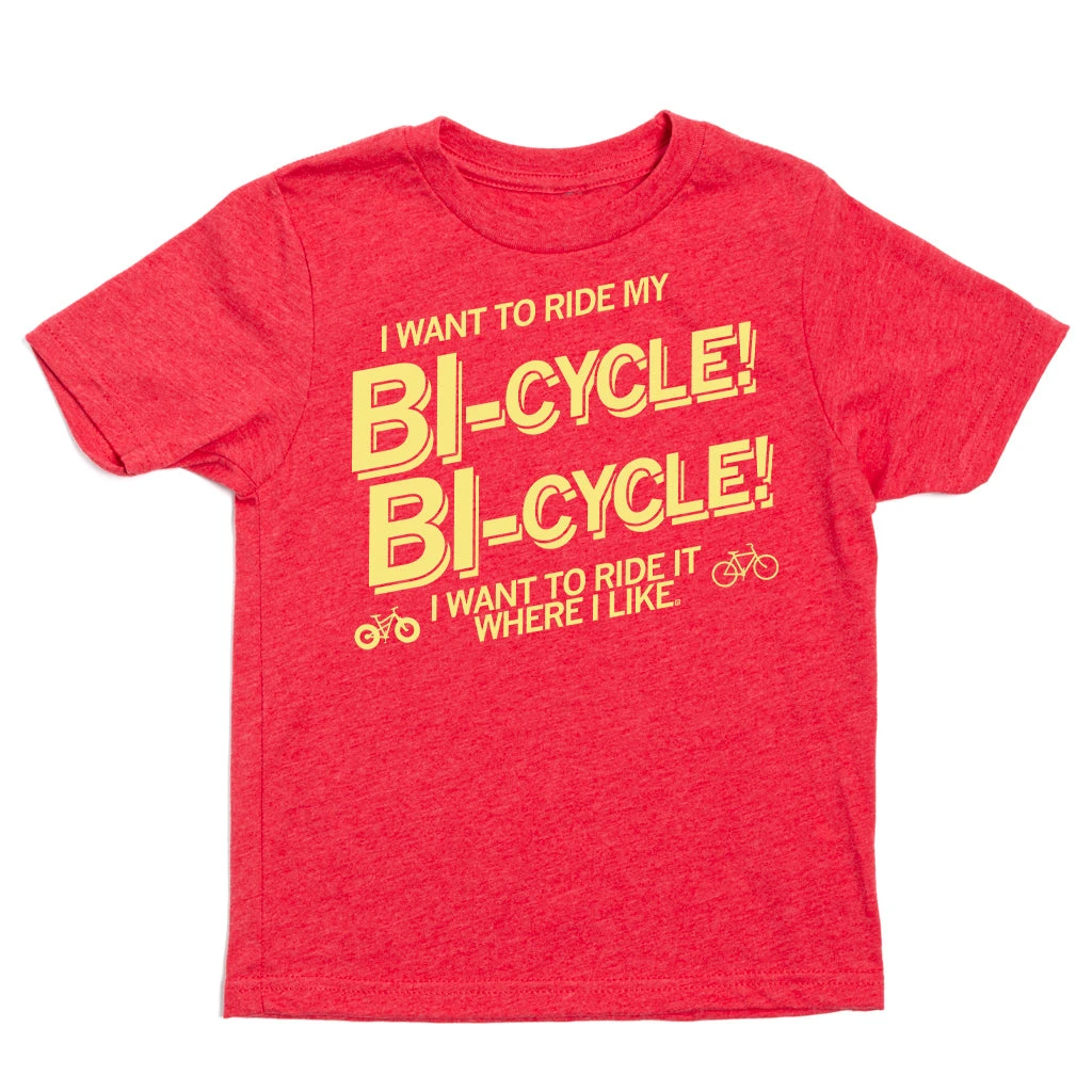 I Want to Ride my Bicycle. I Want to Ride it Where I Like. Primrose Screen Print on a Heather Red T-shirt (60% Combed Ringspun Cotton / 40% Polyester ). Cut & sewn sweatshop free. Designed and Printed by Union Labor at RAYGUN.