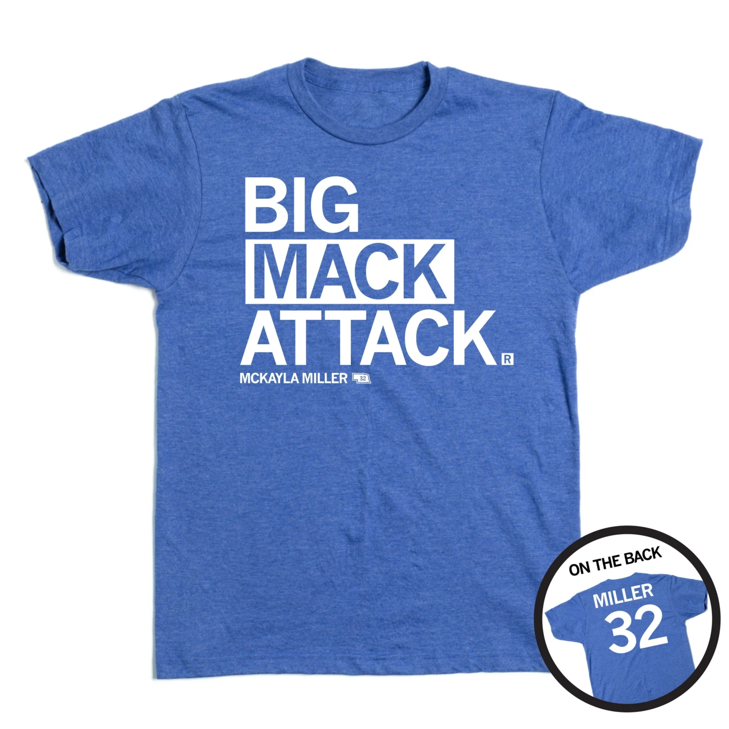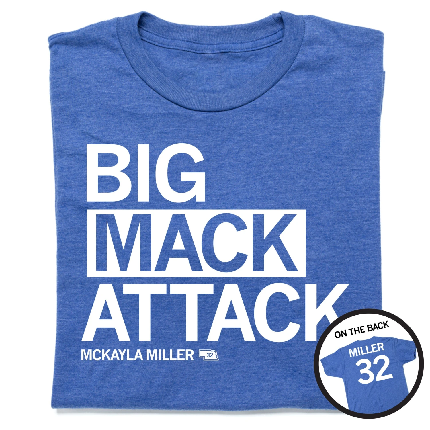 Big Mack Attack. Officially licensed with McKayla Miller. This shirt has been approved by McKayla Miller. A Portion of All RAYGUN Sales Raise Money For Organizations That We Support. White Screen Print on Front and Back on a Heather Royal Blue T-shirt (50% Combed Ringspun Cotton / 50% Polyester). Cut and sewn sweatshop free. Designed and printed by Union Labor at RAYGUN.