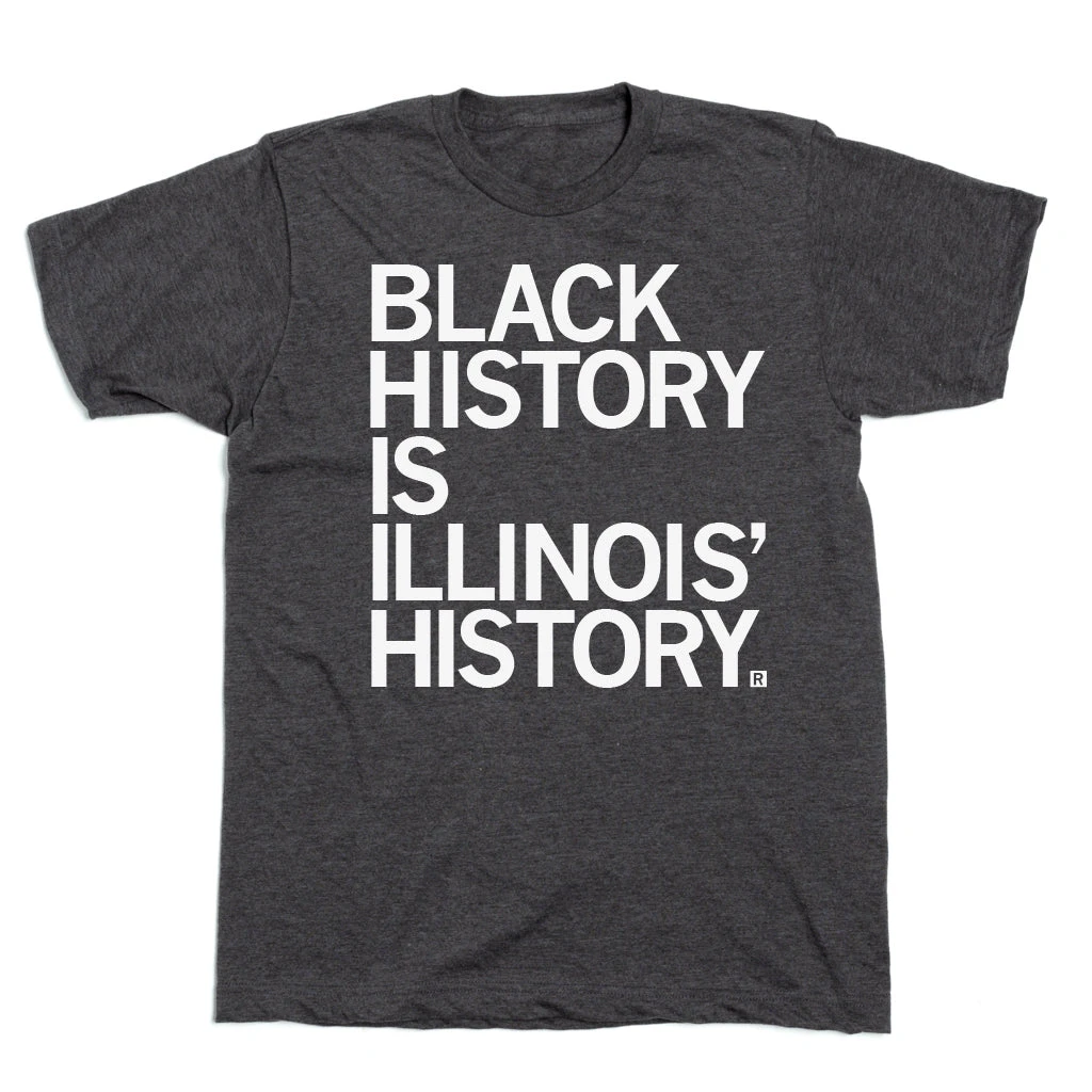 Black History Is Illinois’s History. A portion of sales goes towards our ongoing support to the NAACP as well as African American Museums in our local areas. White Screen Print on a Charcoal T-shirt (50% Combed Ringspun Cotton / 50% Polyester). Cut and sewn sweatshop free. Designed and printed by Union Labor at RAYGUN.
