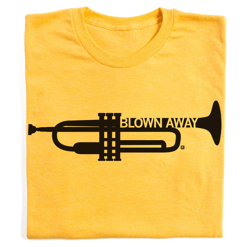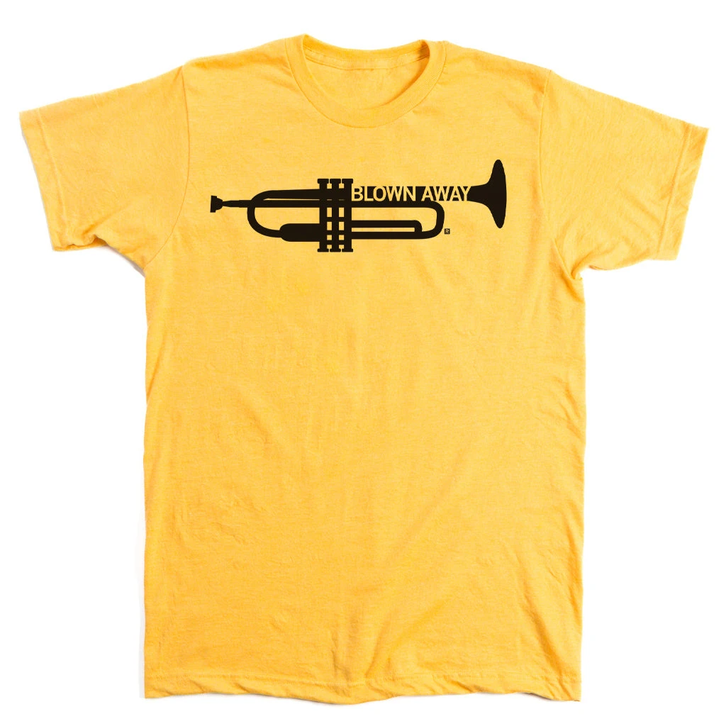Blown Away. A Portion of All RAYGUN Sales Raise Money For Organizations That We Support. Black Screen Print on a Heather Mellow Yellow T-shirt (50% Combed Ringspun Cotton / 50% Polyester). Cut and sewn sweatshop free. Designed and printed by Union Labor at RAYGUN.