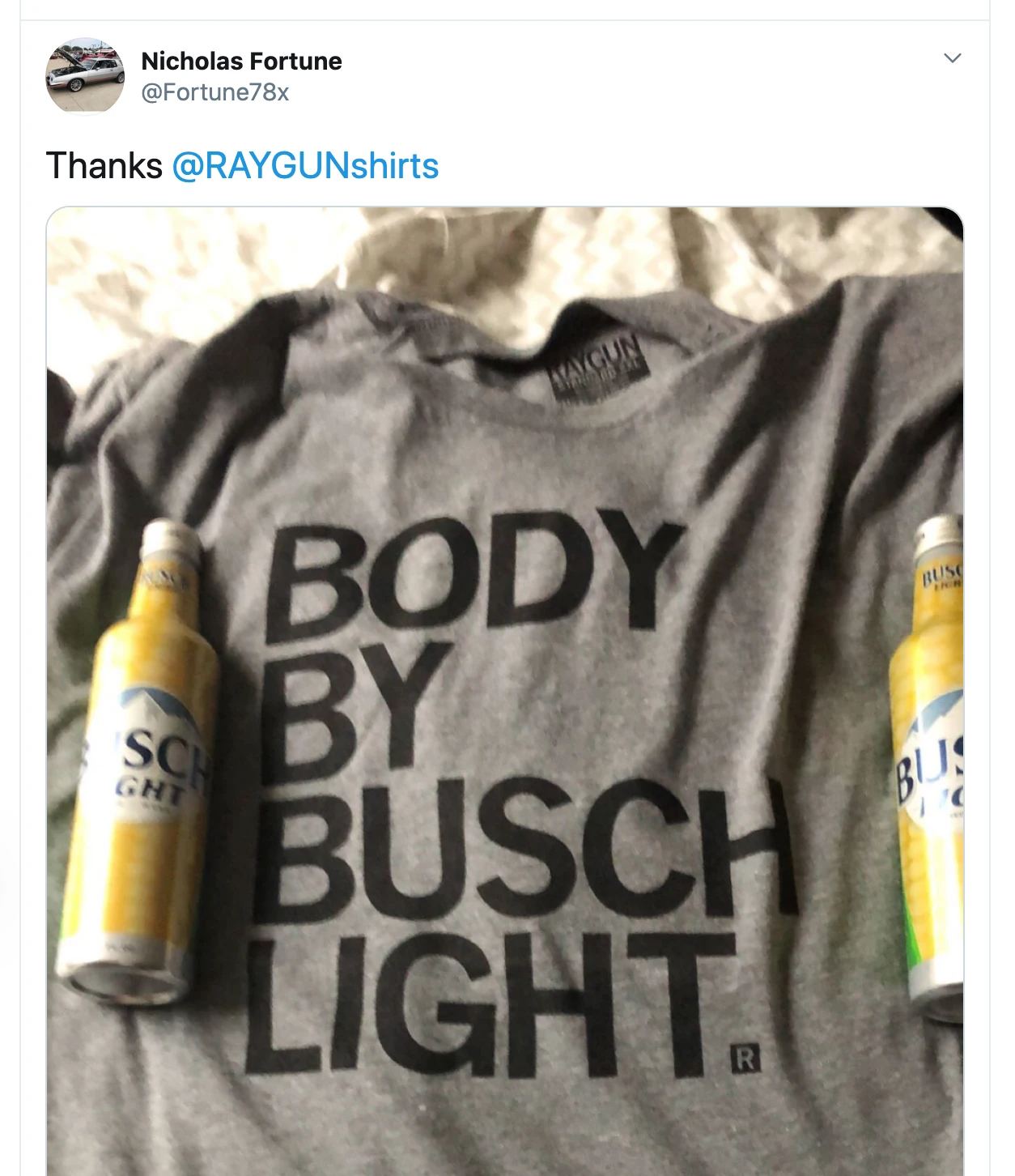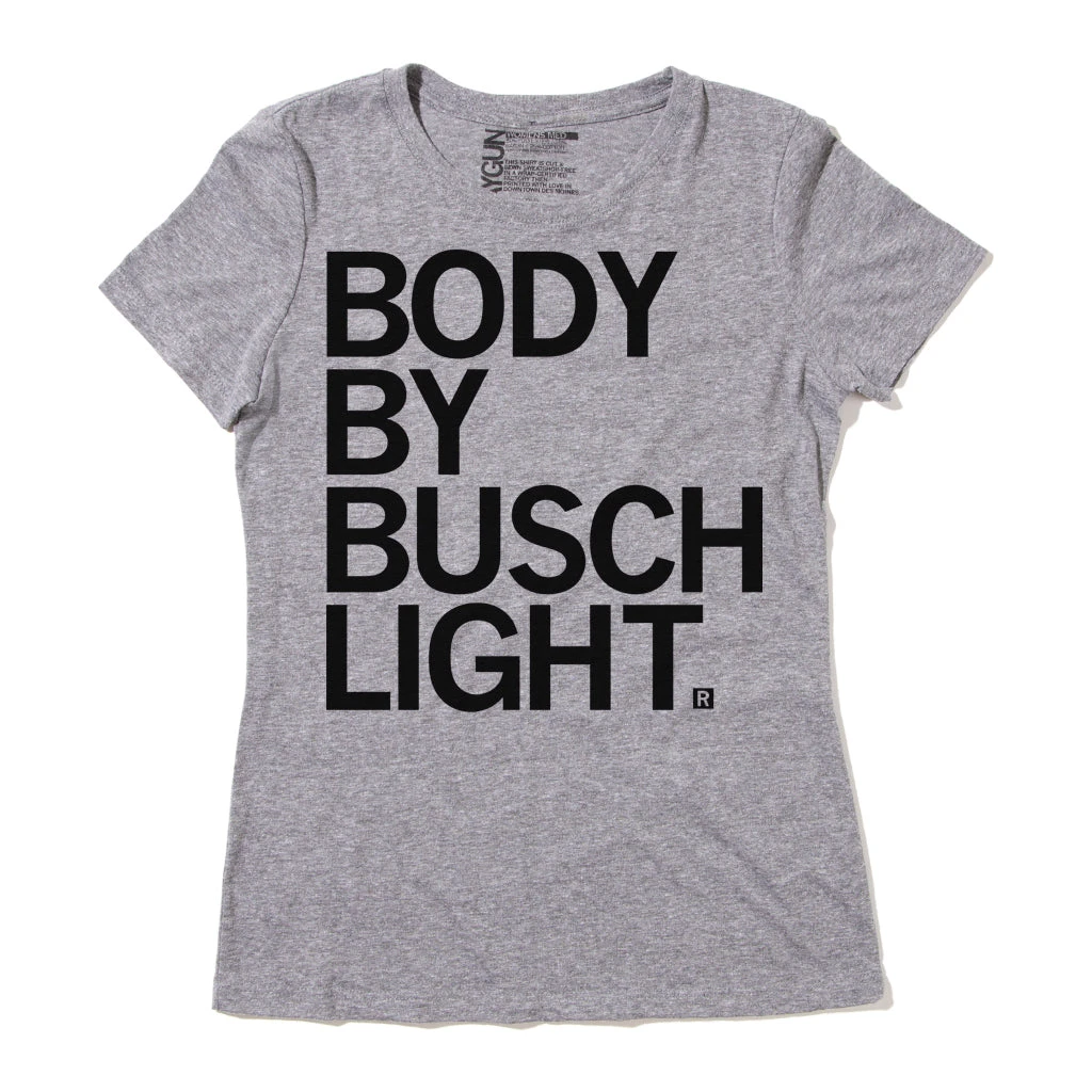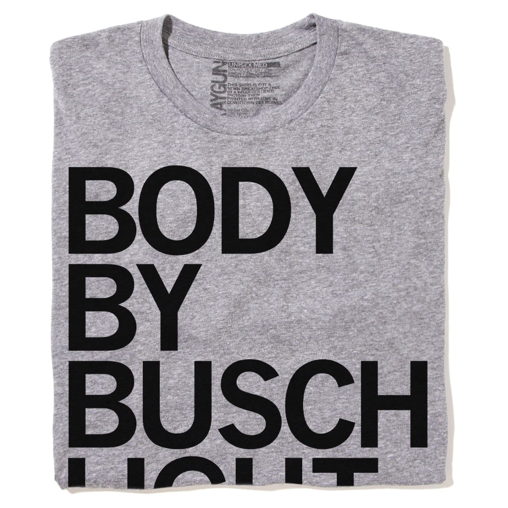 Body By Busch Light. A Portion of All RAYGUN Sales Raise Money For Organizations That We Support. Black Screen Print on a Heather Grey T-shirt (65% Polyester / 35% Combed Ringspun Cotton). Cut and sewn sweatshop free. Designed and printed by Union Labor at RAYGUN.