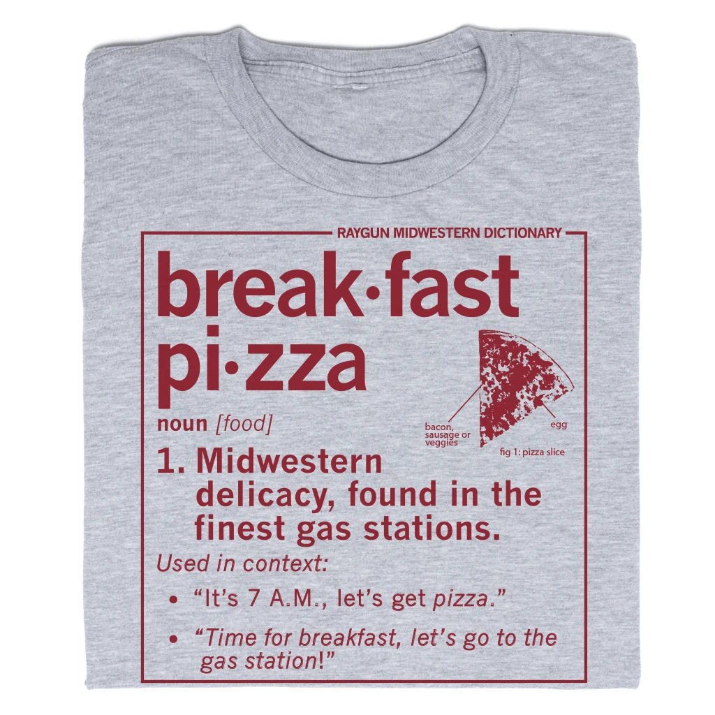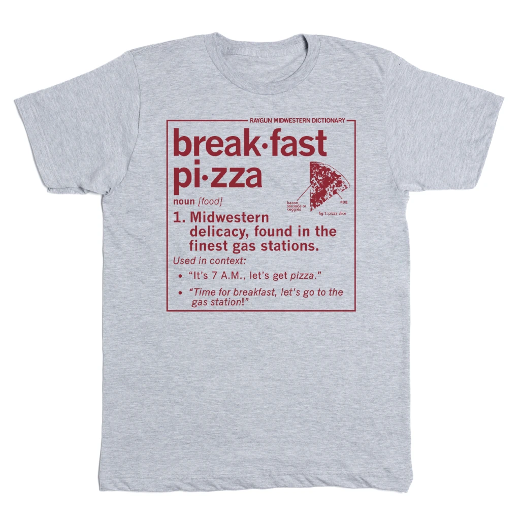 RAYGUN Midwestern Dictionary: Breakfast Pizza Edition. A Portion of All RAYGUN Sales Raise Money For Organizations That We Support. Cardinal Screen Print on a Light Grey T-shirt (90% Combed Ringspun Cotton / 10% Polyester). Cut and sewn sweatshop free. Designed and printed by Union Labor at RAYGUN.