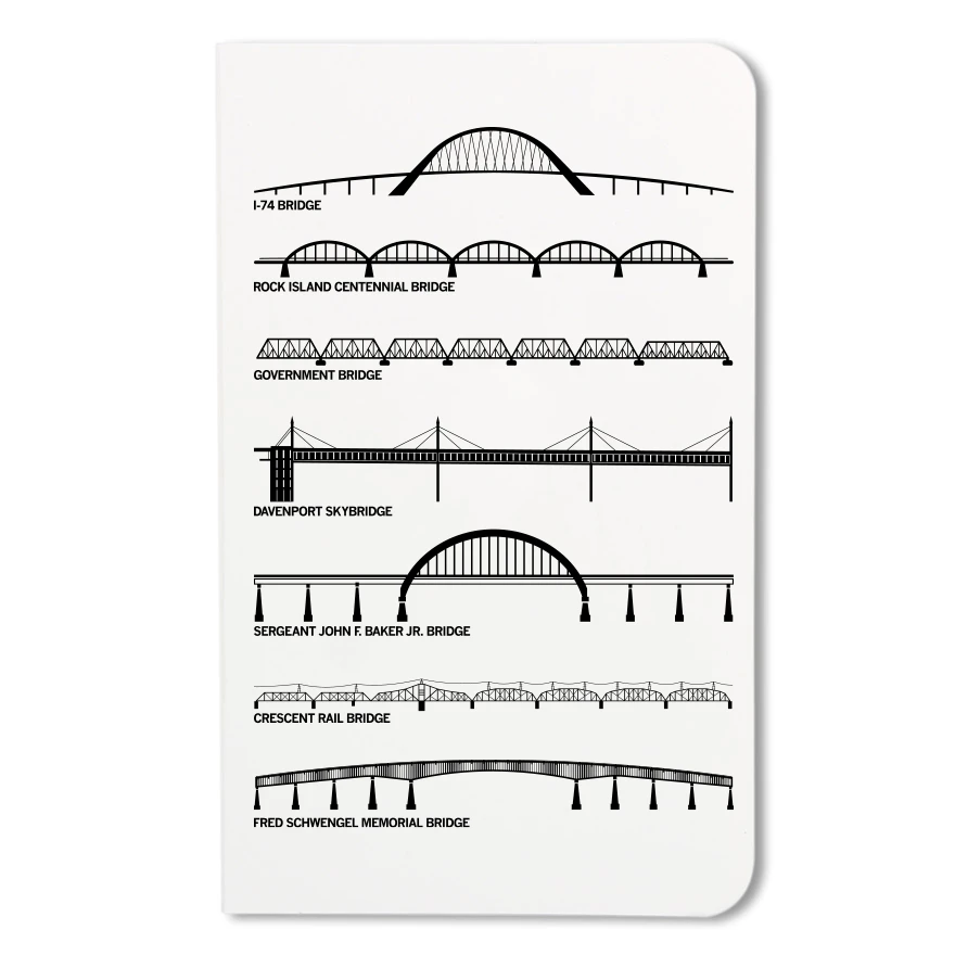 Bridges of The Quad Cities. Black Screen Print on Unlined paper made in the USA, and dimensionsn is 5.5″ x 8.5″. Assembled using union labor at Garner Printing in Des Moines, IA.