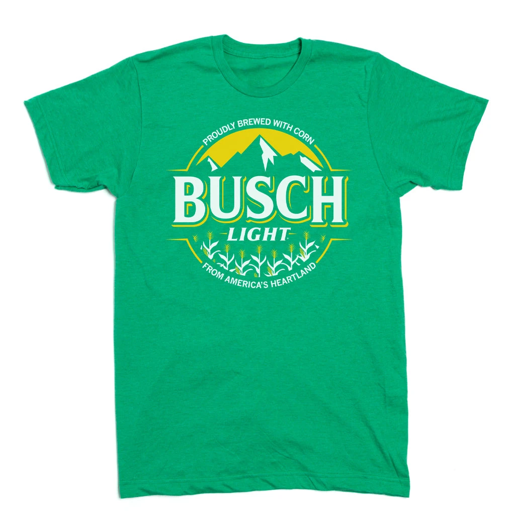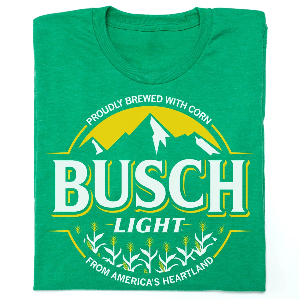 Busch Light: Proudly brewed with corn from America’s Heartland. A Portion of All RAYGUN Sales Raise Money For Organizations That We Support. White & Gold Screen Print on a Heather Kelly Green T-shirt (50% Combed Ringspun Cotton / 50% Polyester) Cut & sewn sweatshop free. Designed and Printed by Union Labor at RAYGUN.