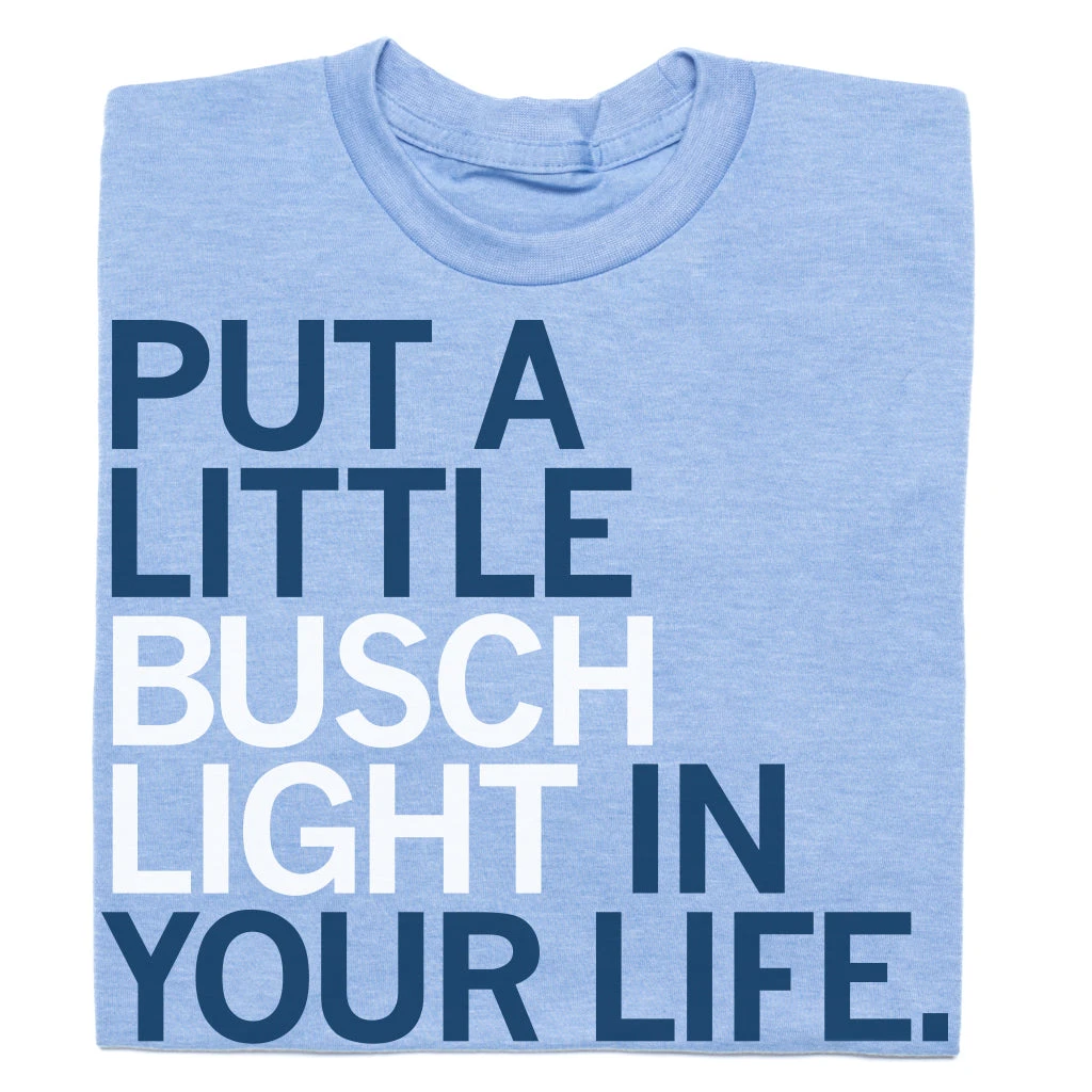 Put A Little Busch Light In Your Life. White and Navy Blue Screen Print on a Heather Athletic Blue T-shirt (65% Polyester / 35% Combed Ringspun Cotton). Cut and sewn sweatshop free. Designed and printed by Union Labor at RAYGUN.