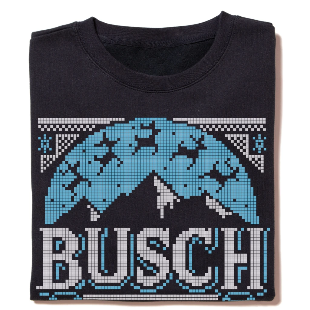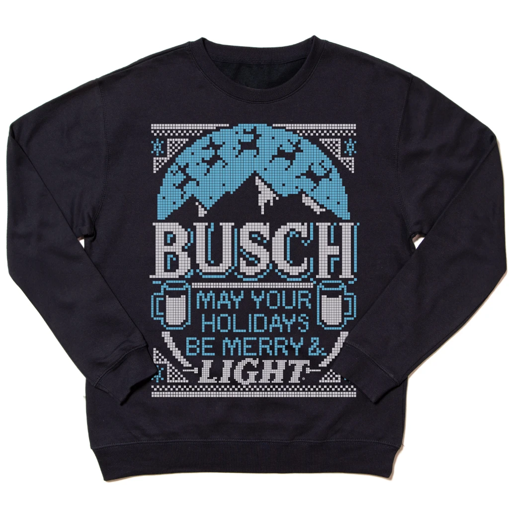 Busch Light: May Your Holidays Be Merry & Light. A Portion of All RAYGUN Sales Raise Money For Organizations That We Support. Brite Blue and White Screen Print on a Navy Crew Sweatshirt (52% Combed Ringspun Cotton / 48% Polyester). Cut & sewn sweatshop free. Designed and Printed by Union Labor at RAYGUN.