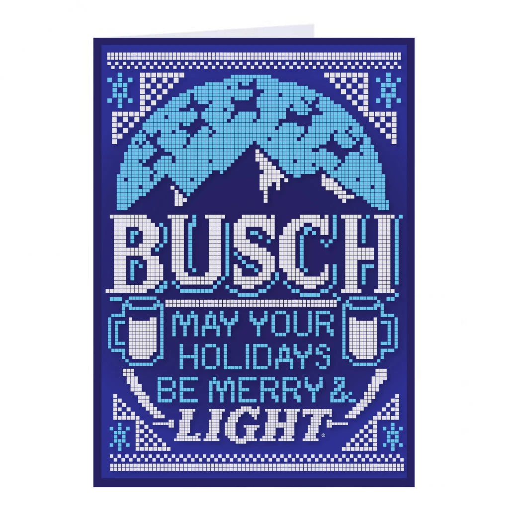 Busch Light: May your holidays be merry & light. A Portion of All RAYGUN Sales Raise Money For Organizations That We Support. 5″ x 7″ Folded Greeting Card. Inside of the card is blank and envelope included. Designed by RAYGUN and printed by union labor at Garner Printing in Des Moines, IA.