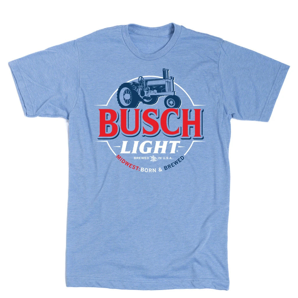 Busch Light: Midwest born & brewed. A Portion of All RAYGUN Sales Raise Money For Organizations That We Support. Red, White, and Navy Screen Print on an Athletic Blue T-shirt (65% Polyester / 35% Combed Ringspun Cotton). Cut & sewn sweatshop free. Designed and Printed by Union Labor at RAYGUN.