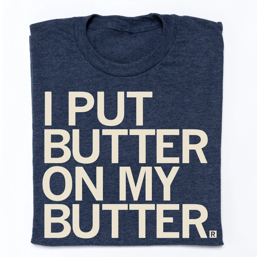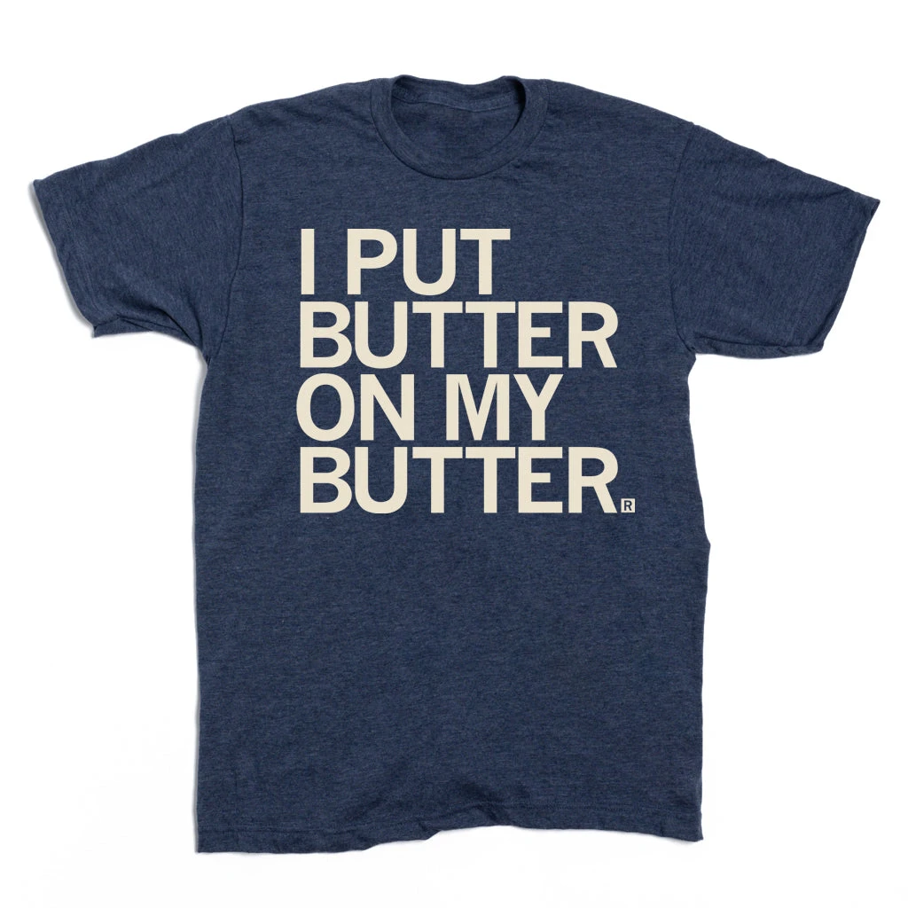I Put Butter on my Butter. Butter is my Favorite Food. A Portion of All RAYGUN Sales Raise Money For Organizations That We Support. Cream Screen Print on a Heather Denim T-shirt (50% Combed Ringspun Cotton / 50% Polyester). Cut and sewn sweatshop free. Designed and printed by Union Labor at RAYGUN.