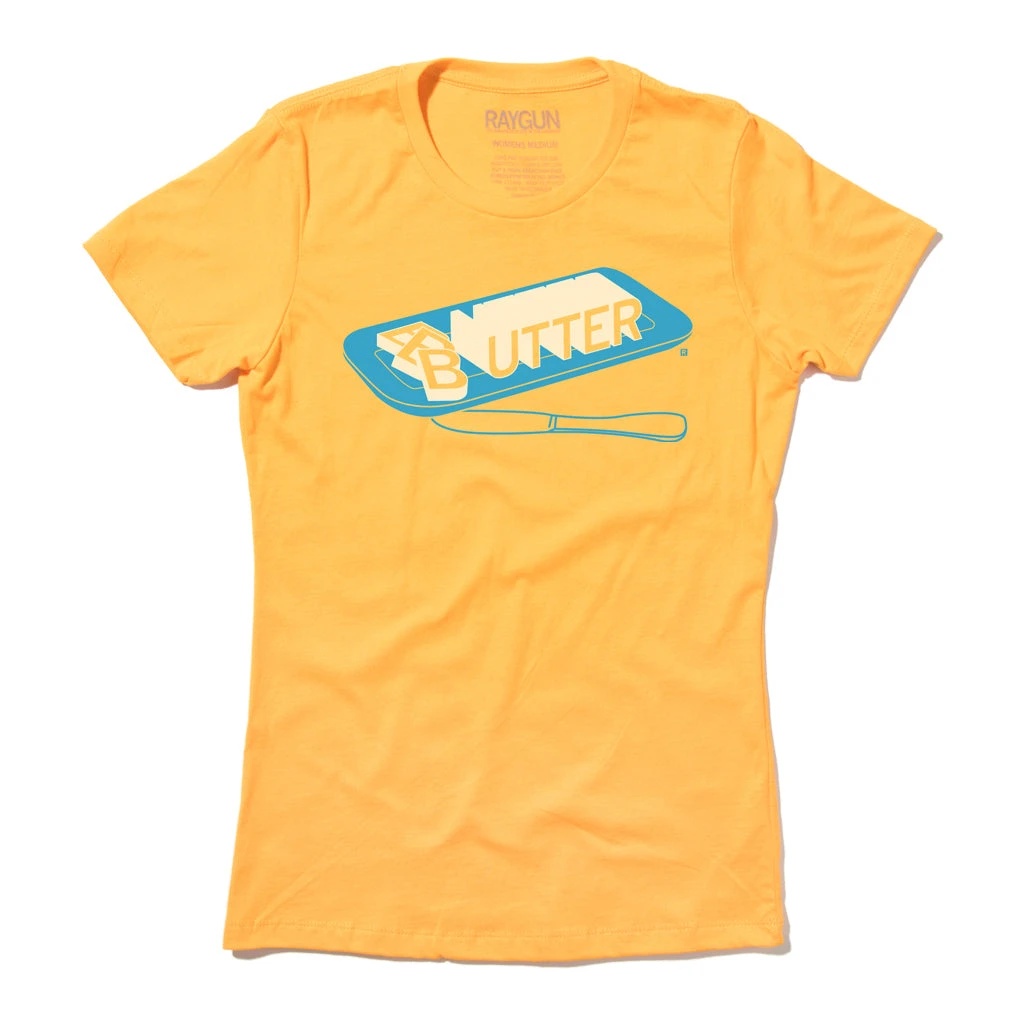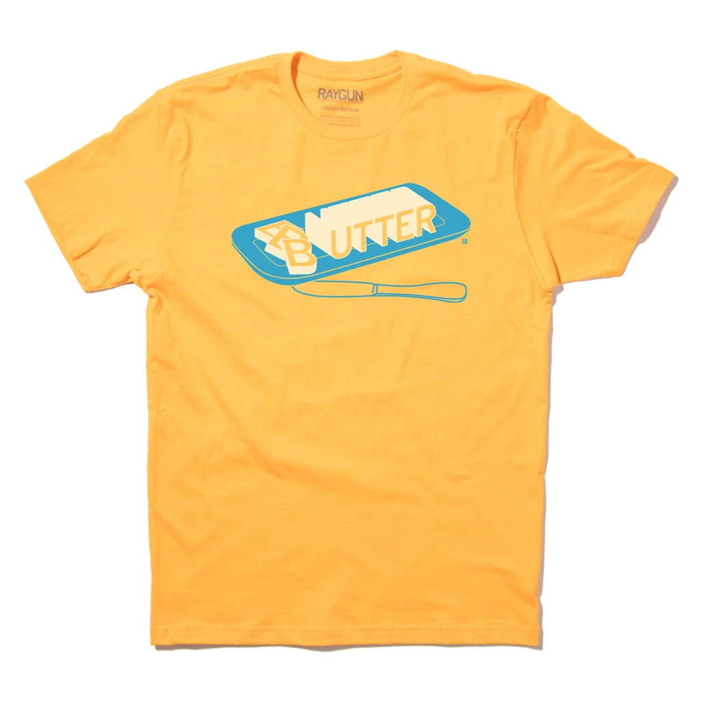 I can believe it is Butter. A Portion of All Raygun Sales Raise Money For Organizations That We Support. Cream & Brite Blue Screen Print on a Gold T-Shirt (100% Combed Ringspun Cotton). Cut and sewn sweatshop free. Designed and printed by Union Labor at RAYGUN.