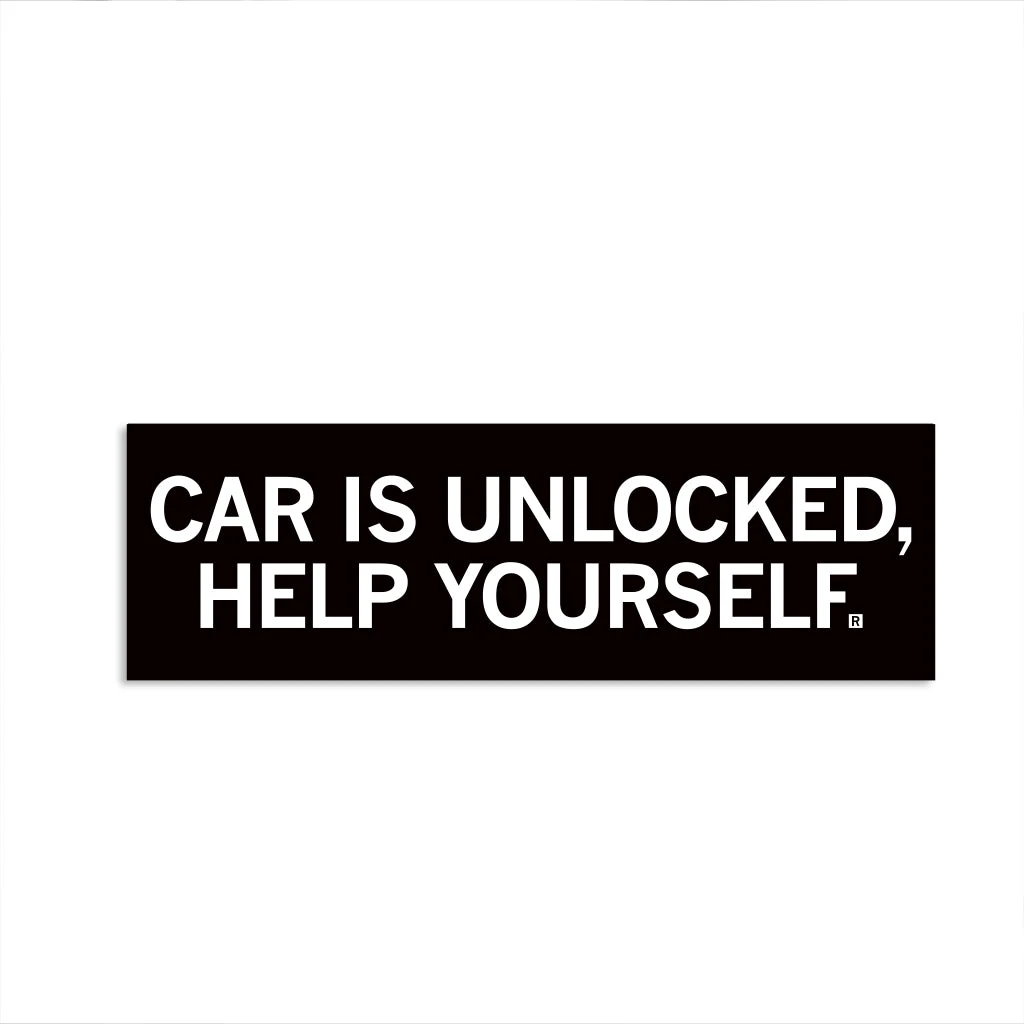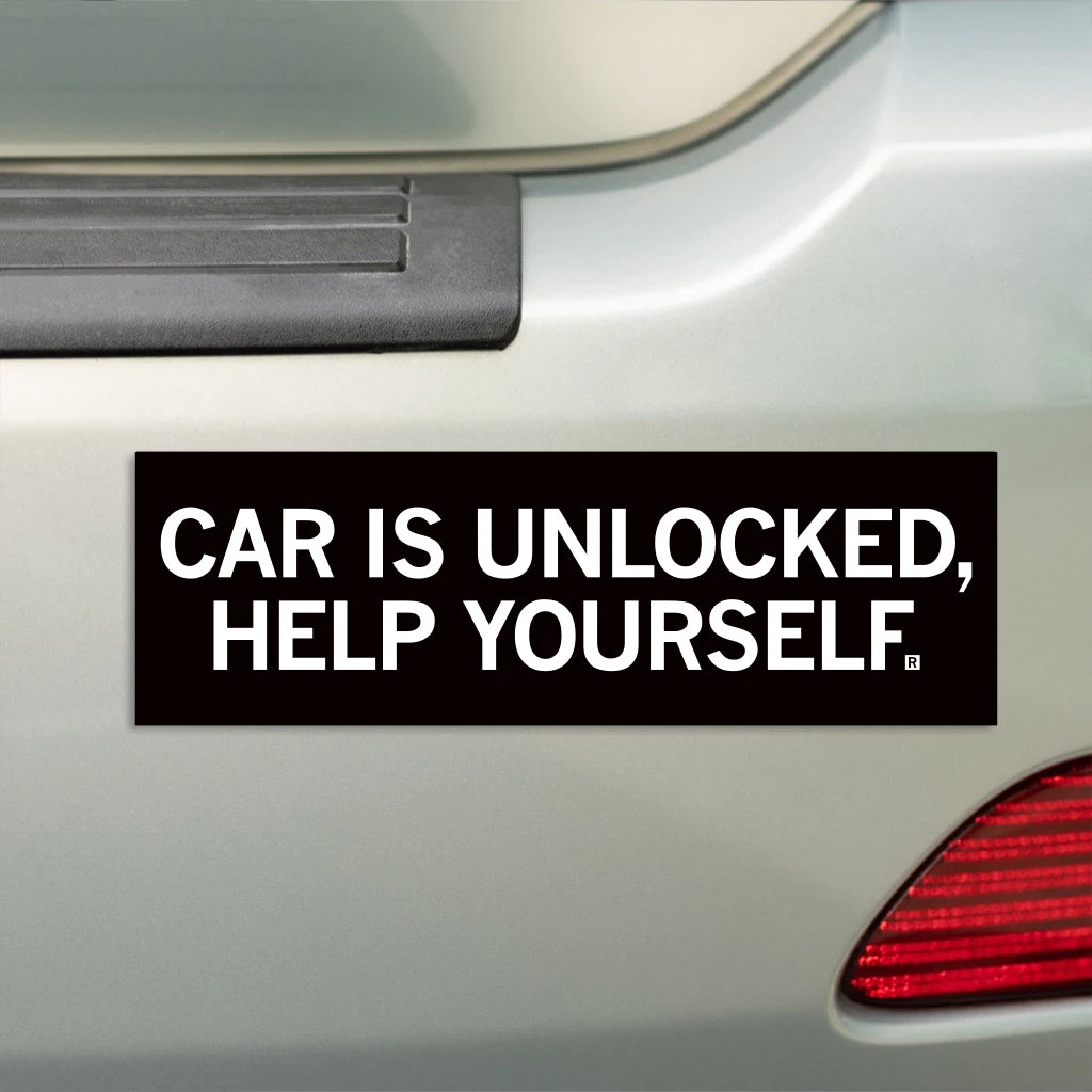 Car is unlocked, help yourself. A Portion of All RAYGUN Sales Raise Money For Organizations That We Support. 10″ x 3″ Vinyl Bumper Sticker. Designed by RAYGUN and printed by Sinclair Graphics in Des Moines, IA.