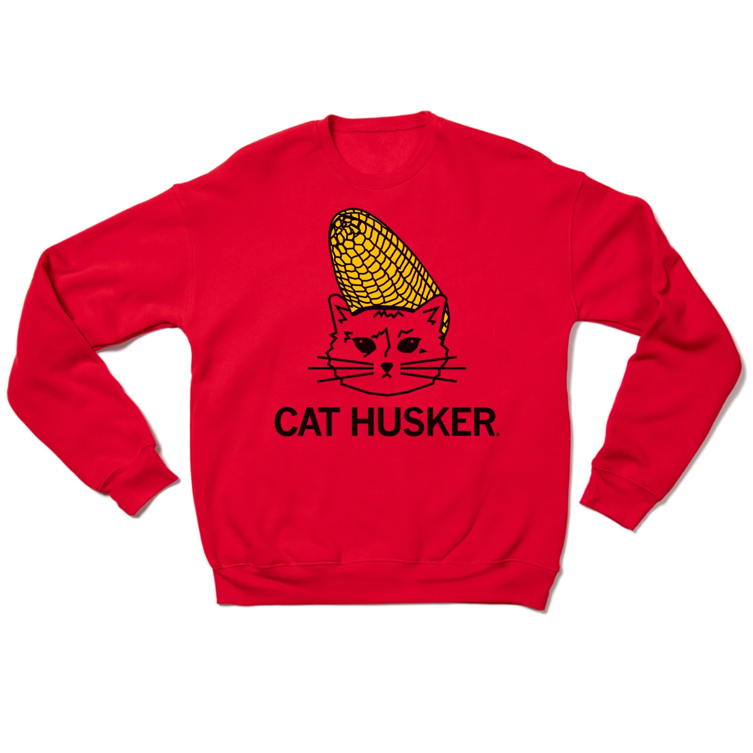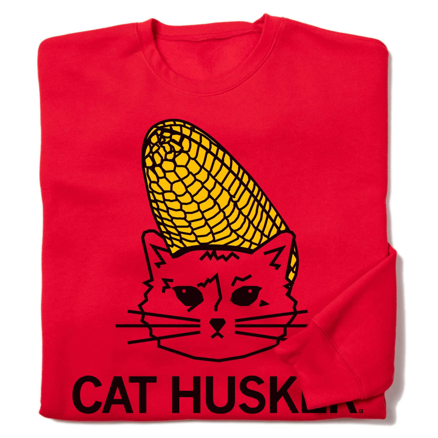 Cat Husker. A Portion of All RAYGUN Sales Raise Money For Organizations That We Support. Black and Golden Yellow Screen Print on a Red Crew Sweatshirt (52% Combed Ringspun Cotton / 48% Polyester). Cut and sewn sweatshop free. Designed and printed by Union Labor at RAYGUN.