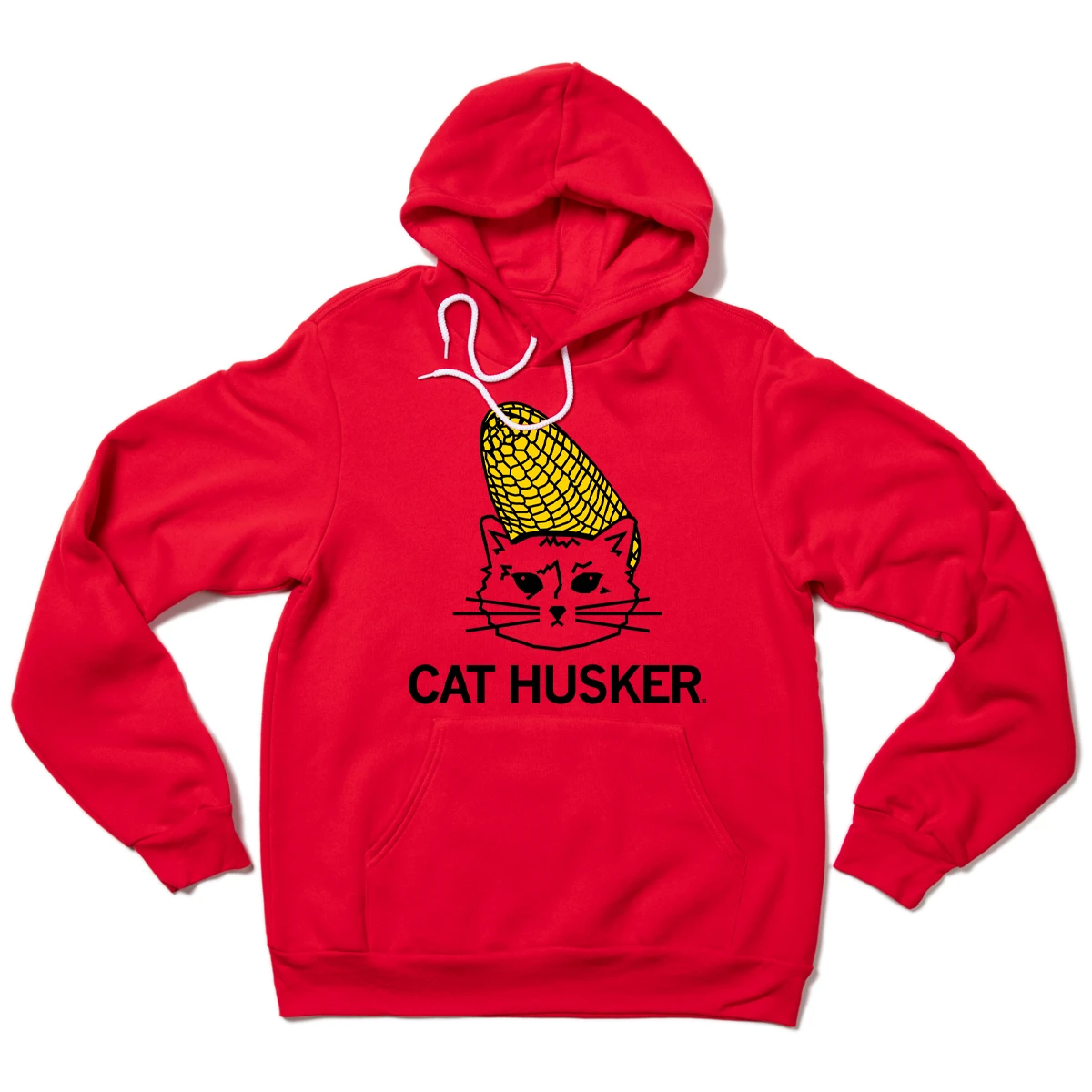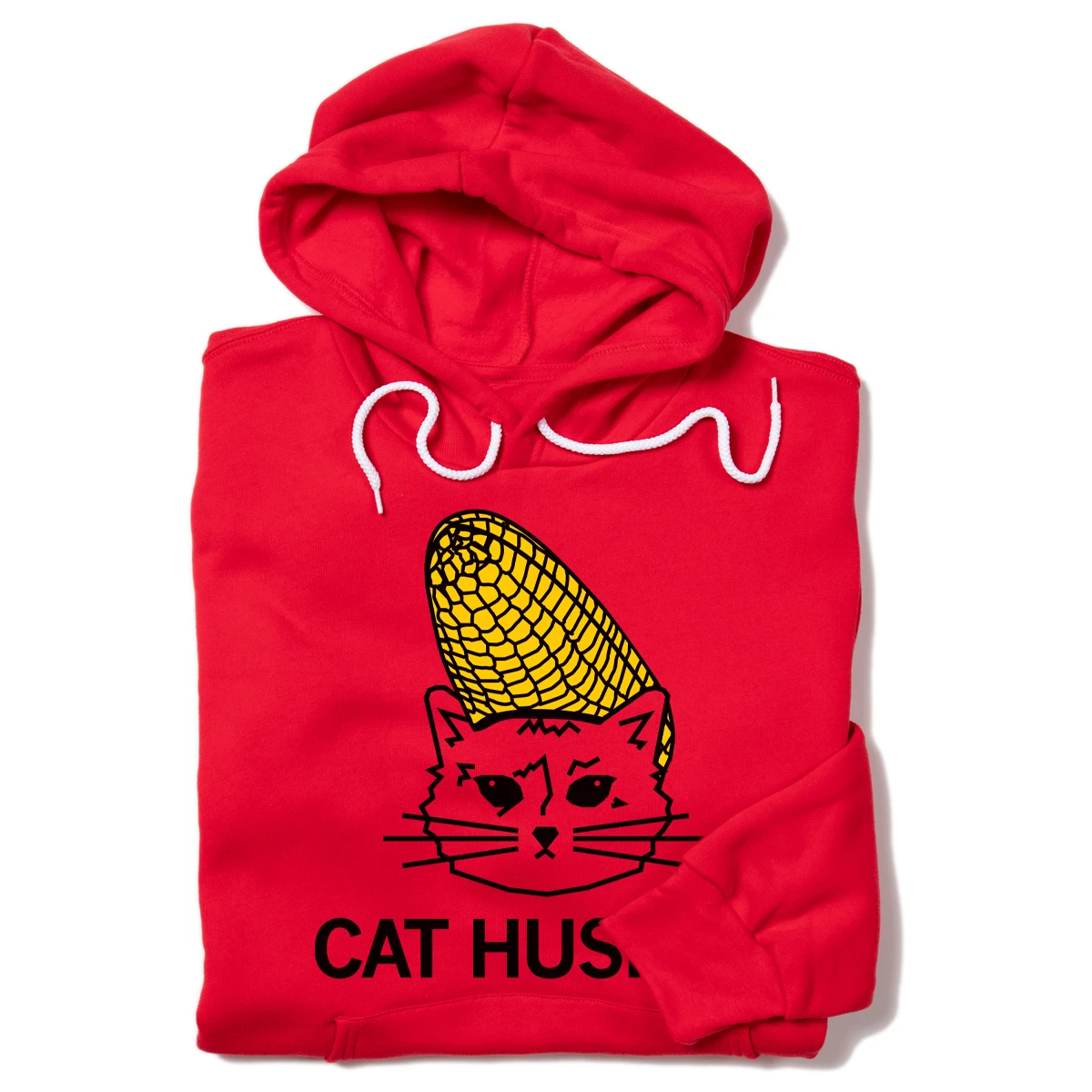 Cat Husker. A Portion of All RAYGUN Sales Raise Money For Organizations That We Support. Black and Yellow Screen Print on a Red Pullover Hoodie (52% Combed Ringspun Cotton / 48% Polyester). Cut and sewn sweatshop free. Designed and printed by Union Labor at RAYGUN.