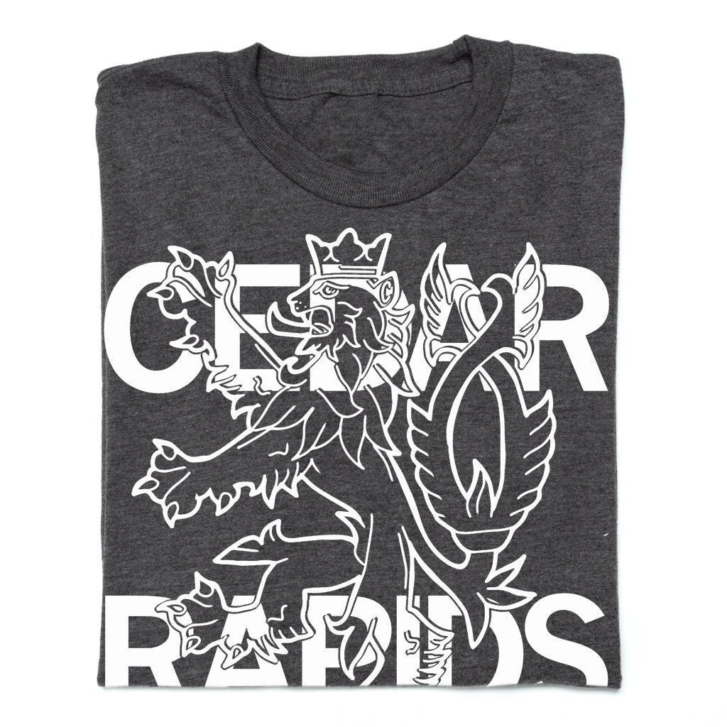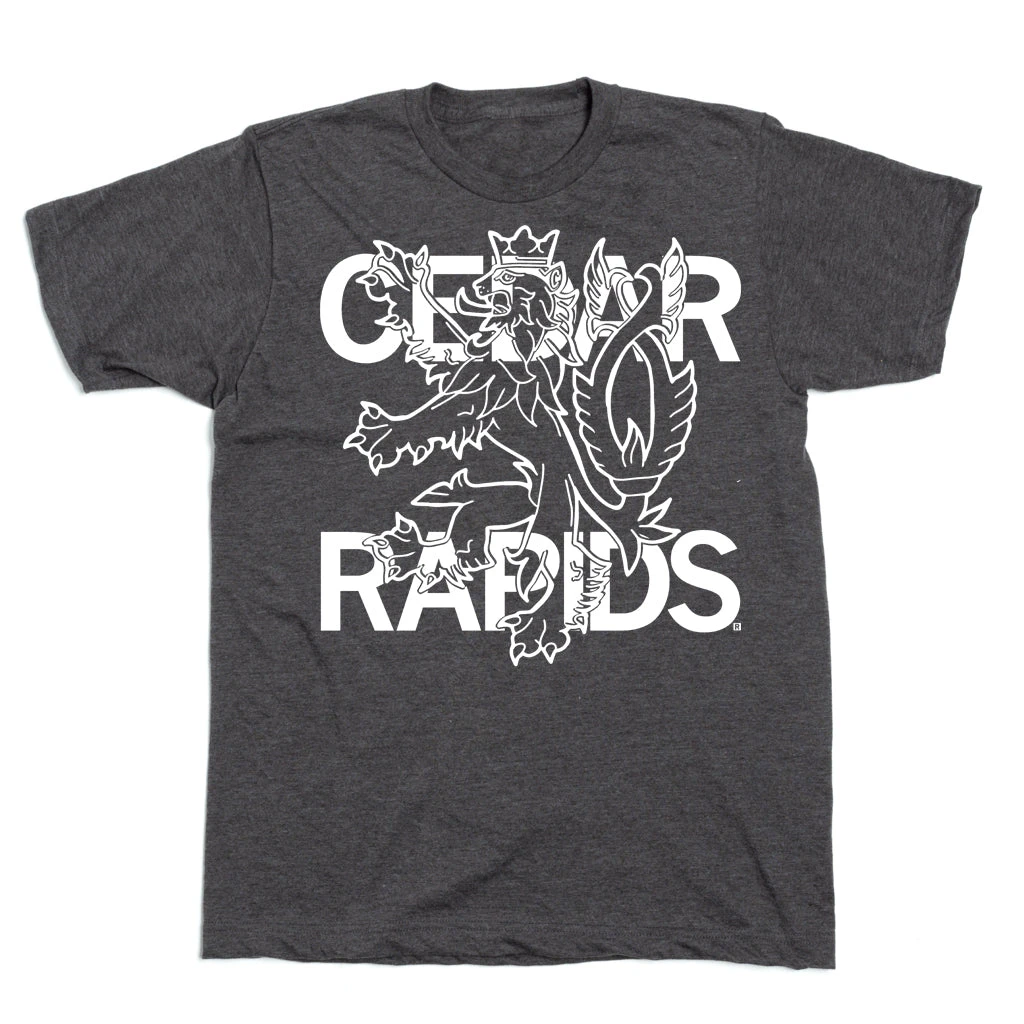 Cedar Rapids: Lions & Lions & Lions, Oh My. This Design Has Been Retired and is No Longer Available on Our Sales Floors But Can Be Ordered Here Online! Since All of Our Retired Designs Are Printed on Demand, Please Allow For a Couple Extra Days Before Shipping. A Portion of All Raygun Sales Raise Money For Organizations That We Support. White Screen Print on a Charcoal T-shirt (50% Combed Ringspun Cotton / 50% Polyester). Cut and sewn sweatshop free. Designed and printed by Union Labor at RAYGUN.