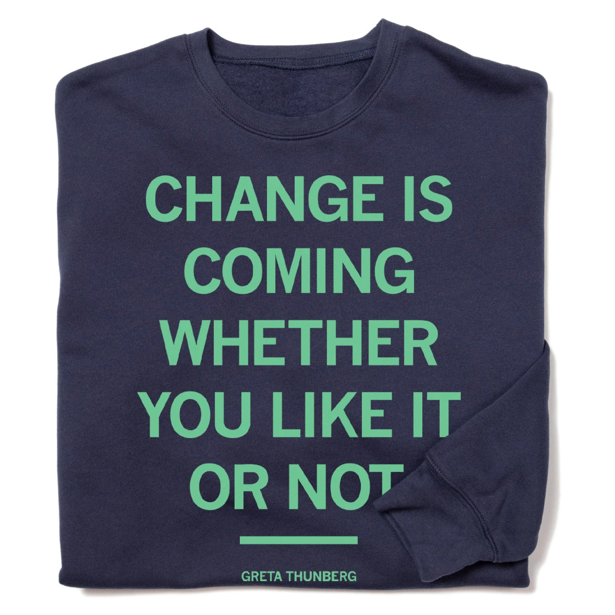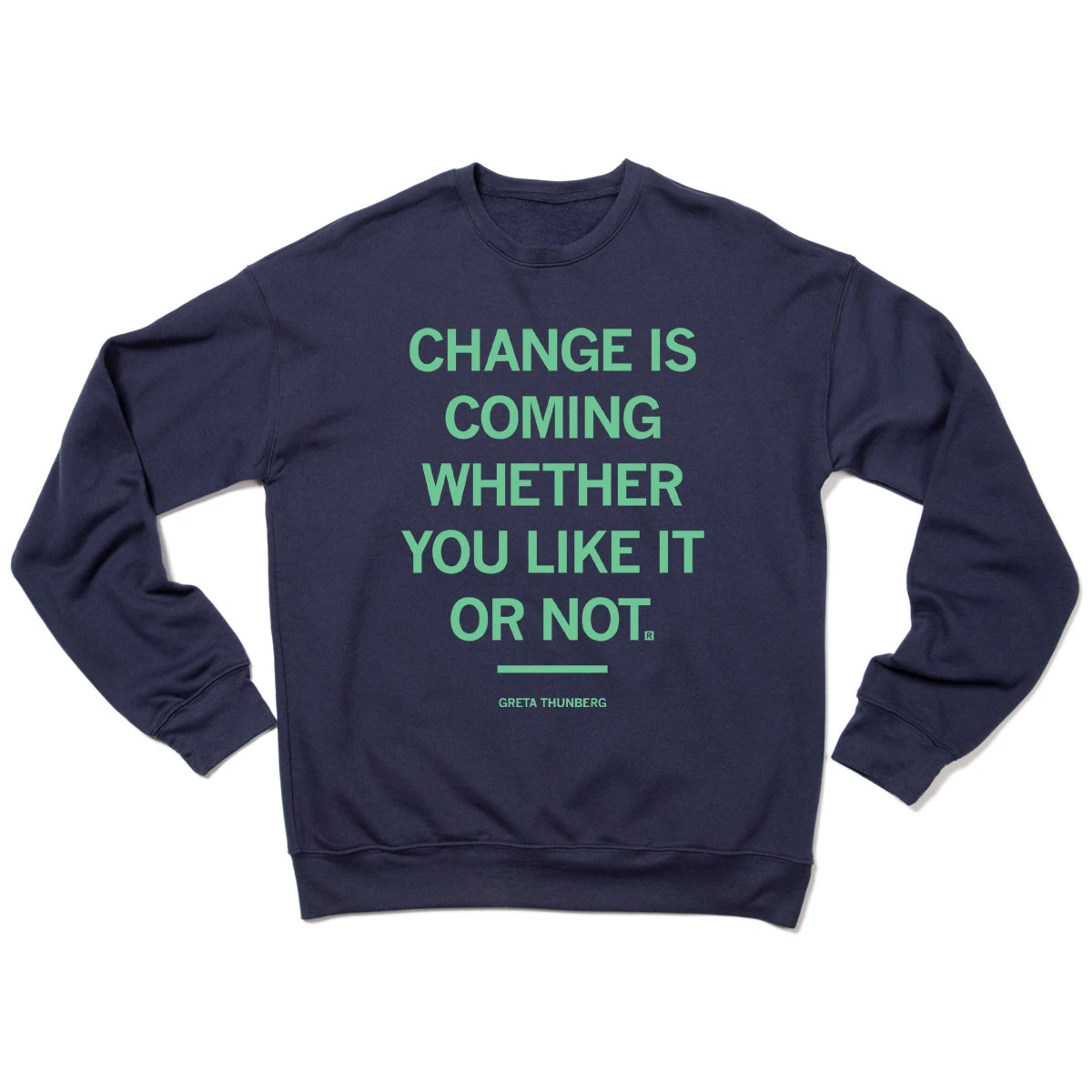 “Change Is Coming Whether You Like It Or Not” – Greta Thunberg. Some Proceeds Benefit the Alliance for the Great Lakes. RAYGUN is also a donor to the Environmental Law Policy Center, which advocates for the Great Lakes. Wasabit Screen Print on a Heather Navy Crew Sweatshirt (80% Combed Ringspun Cotton / 20% Polyester). Cut and sewn sweatshop free. Designed and printed by Union Labor at RAYGUN.