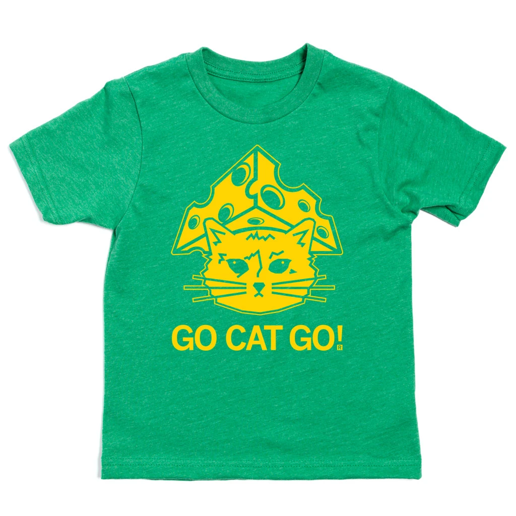 Gary says Go Cat Go! A Portion of All RAYGUN Sales Raise Money For Organizations That We Support. Gold Screen Print on a Kelly Green T-Shirt (100% Combed Ringspun Cotton). Cut and sewn sweatshop free. Designed and printed by Union Labor at RAYGUN.