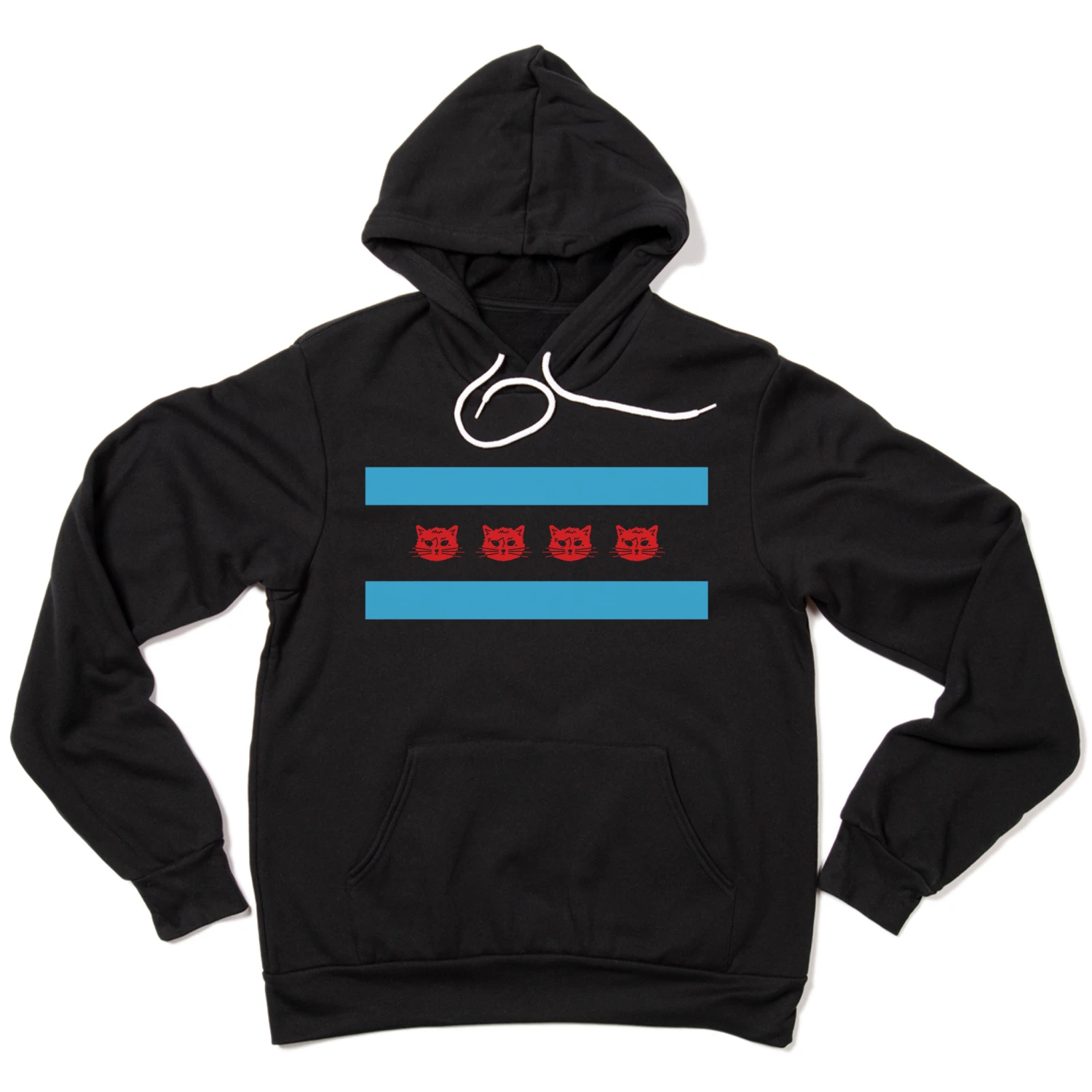 Chicago Flag with… Gary the Cat! A Portion of All RAYGUN Sales Raise Money For Organizations That We Support. Scarlet Red and Light Blue Screen Print on a Pigment Black Pullover Hoodie (52% Combed Ringspun Cotton / 48% Polyester). Cut and sewn sweatshop free. Designed and printed by Union Labor at RAYGUN.