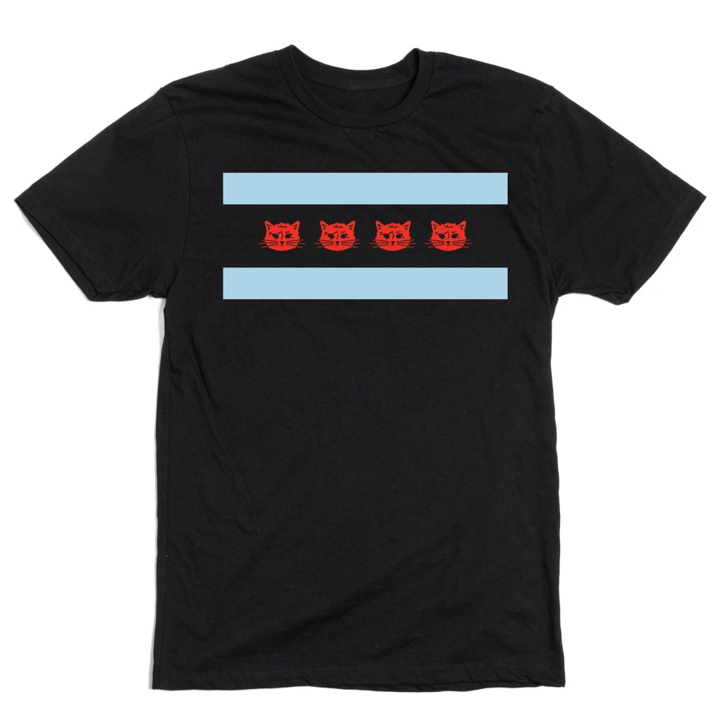 Chicago Flag with… Gary the Cat! A Portion of All RAYGUN Sales Raise Money For Organizations That We Support. Scarlet Red & Light Blue Screen Print on a Black T-shirt (100% Combed Ringspun Cotton). Cut & sewn sweatshop free. Designed and Printed by Union Labor at RAYGUN.