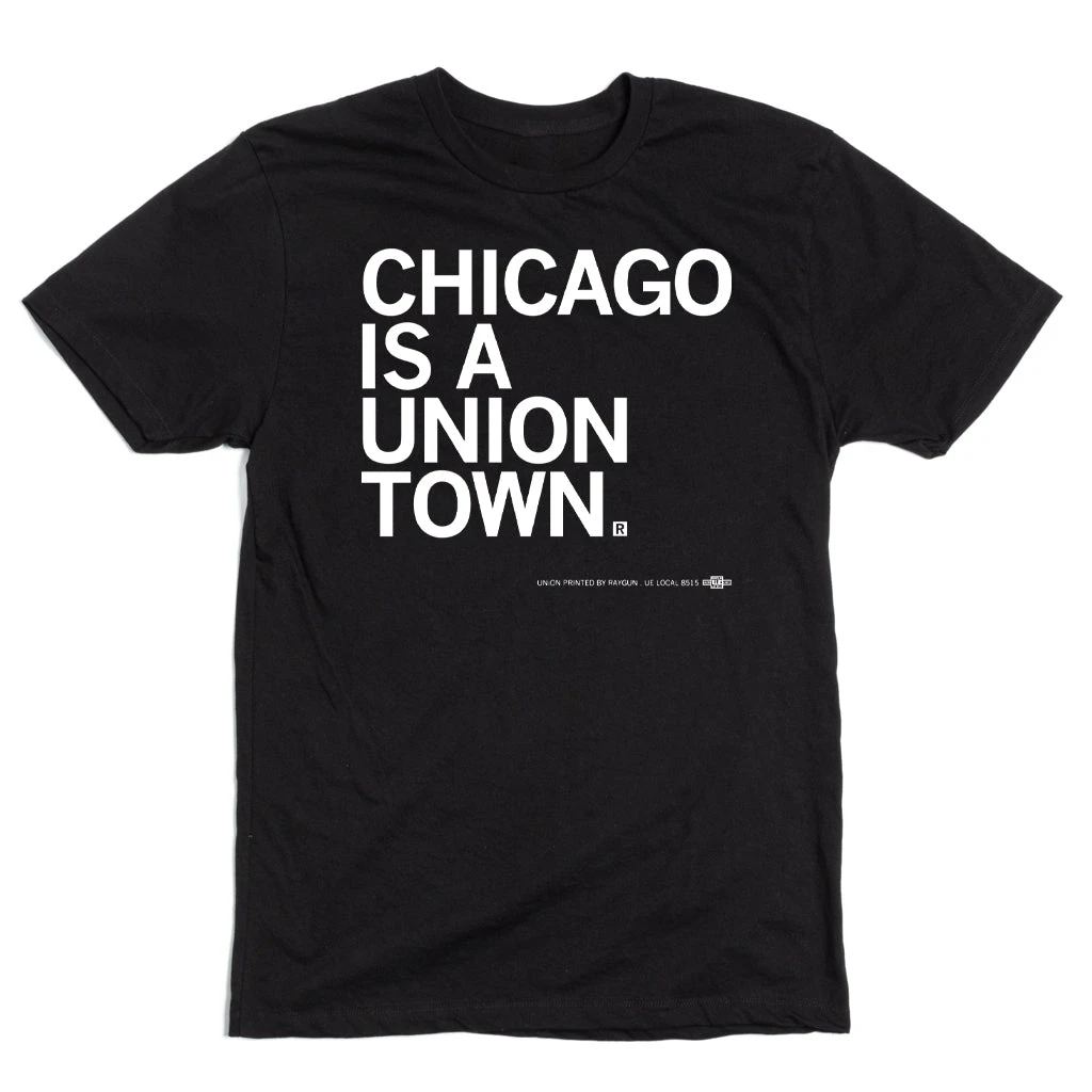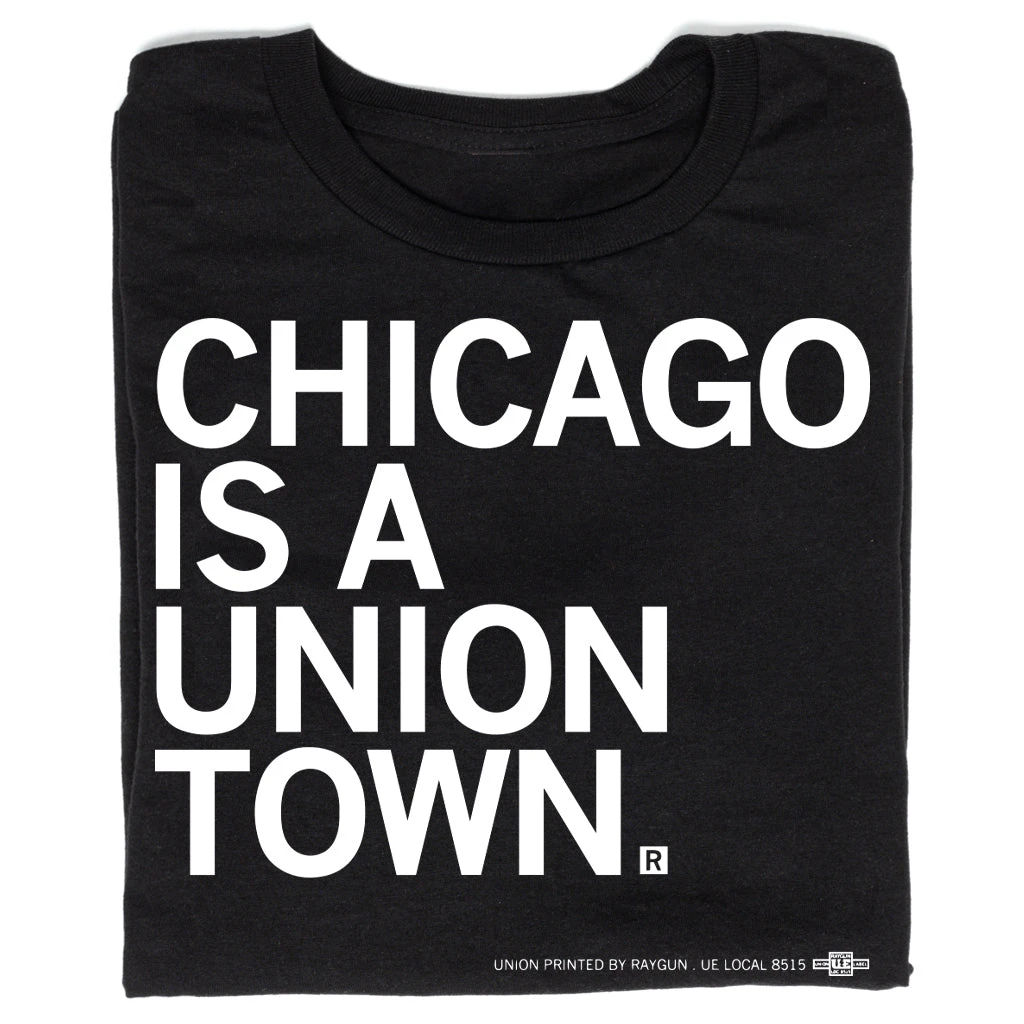 Chicago is a Union Town. A Portion of All RAYGUN Sales Raise Money For Organizations That We Support. White Screen Print on a Black USA Made T-shirt (100% Combed Ringspun Cotton). Cut & sewn sweatshop free. Designed and Printed by Union Labor at RAYGUN.