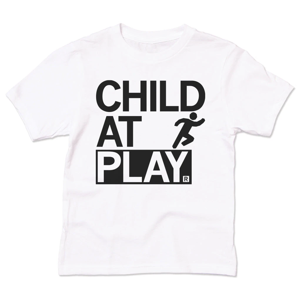 Child At Play. 2T & 4T sizes are a Black Screen Print on a White T-shirt (100% Combed Ringspun Cotton) while 5T (YXS) and above are on a White T-shirt (60% Combed Ringspun Cotton / 40% Polyester) Cut and sewn sweatshop free. Designed and printed by Union Labor at RAYGUN.