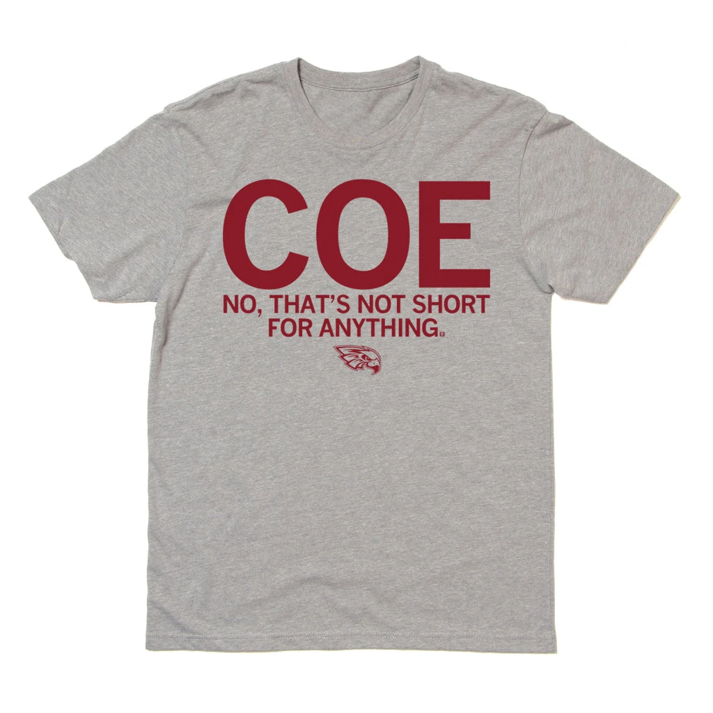 Coe: Not Short For Anything. A Portion of All RAYGUN Sales Raise Money For Organizations That We Support. Maroon Screen Print on a Heather Grey T-Shirt (65% Polyester / 35% Combed Ringspun Cotton). Cut and sewn sweatshop free. Designed and printed by Union Labor at RAYGUN.