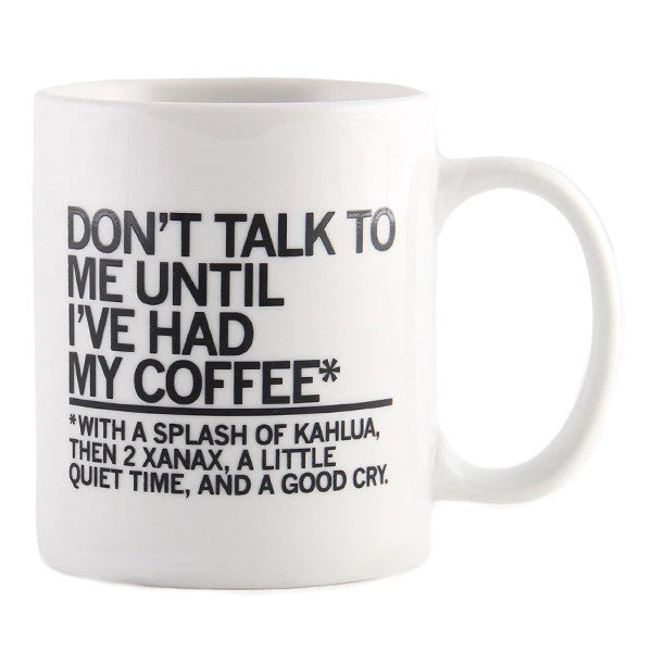 Don’t Talk To Me Until I’ve Had My Coffee With A Splash Of Kahlua, Then 2 Xanax, A Little Quiet Time, And A Good Cry. 11 oz Mug. Fade resistant and dishwasher safe. Designed by RAYGUN and printed by PyroGraphics in Des Moines, IA.