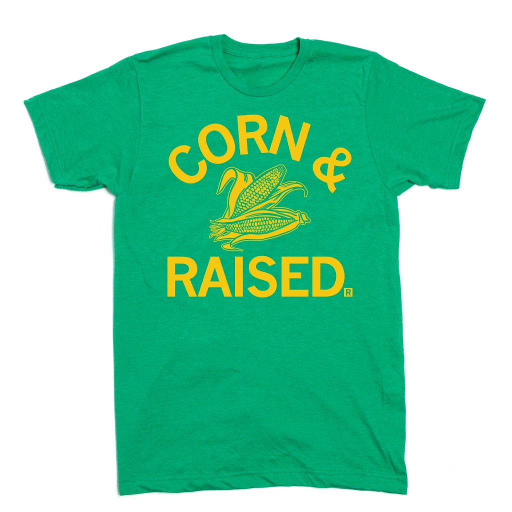 Corn & Raised. A Portion of All Raygun Sales Raise Money For Organizations That We Support. Golden Yellow Screen Print on a Heather Kelly Green T-Shirt (50% Combed Ringspun Cotton / 50% Polyester). Cut and sewn sweatshop free. Designed and printed by Union Labor at RAYGUN.
