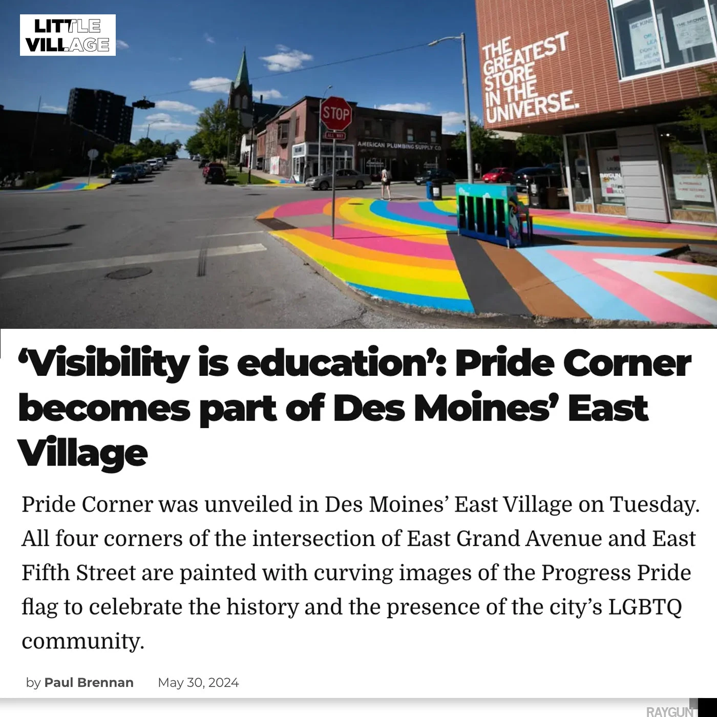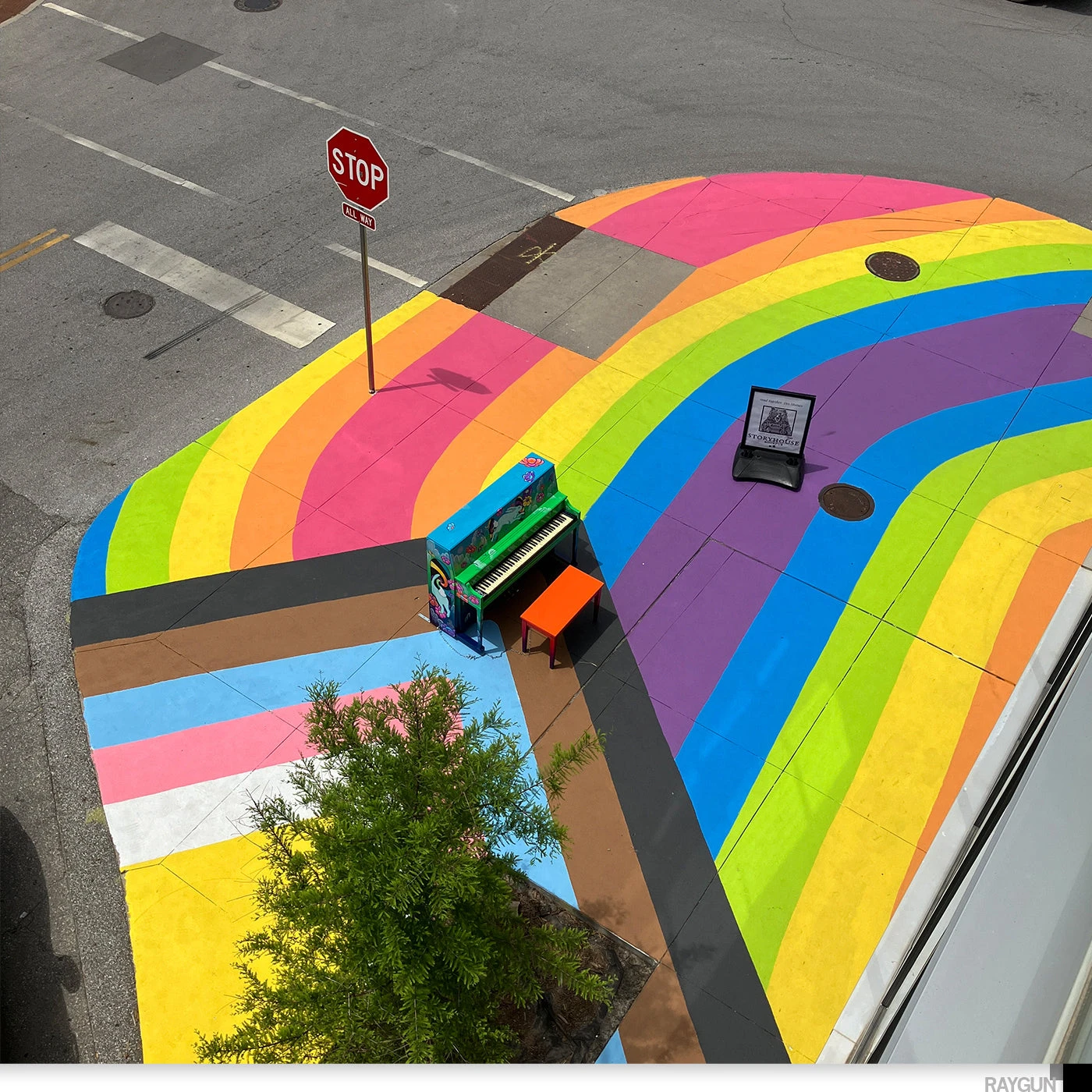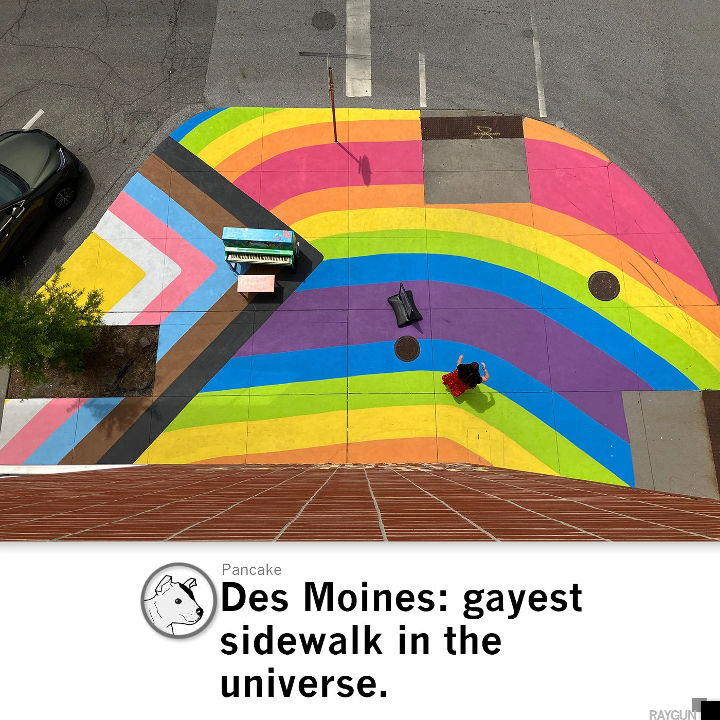 RAYGUN Des Moines is at the corner of Sunshine and Rainbows in the East Village. A portion of sales go to Capital City Pride, who helped to organize the painting of our intersection by artists Cat Rocketship and Dani Awesome. Heat Transfer Print on a White T-shirt (100% Combed Ringspun Cotton). Cut & sewn sweatshop free. Designed and Printed by Union Labor at RAYGUN.